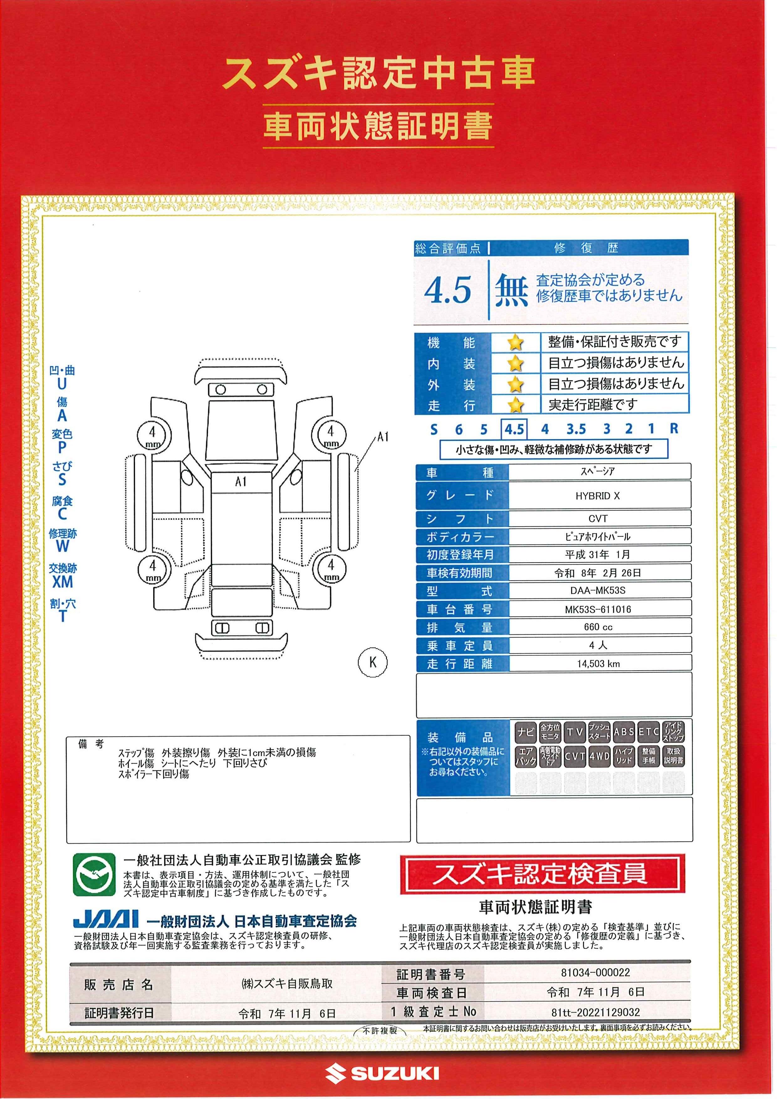 スズキOK保証は保証期間中、通常の使用状態において、お客様のお車に万が一不具合が発生し、スズキ代理店がこれを認めた場合、スズキ代理店及びスズキ代理店の指定する工場において保証書に示す期間と条件に示す期間と条件にしたがって、無償修理いたします。※延長保証のご案内もできます