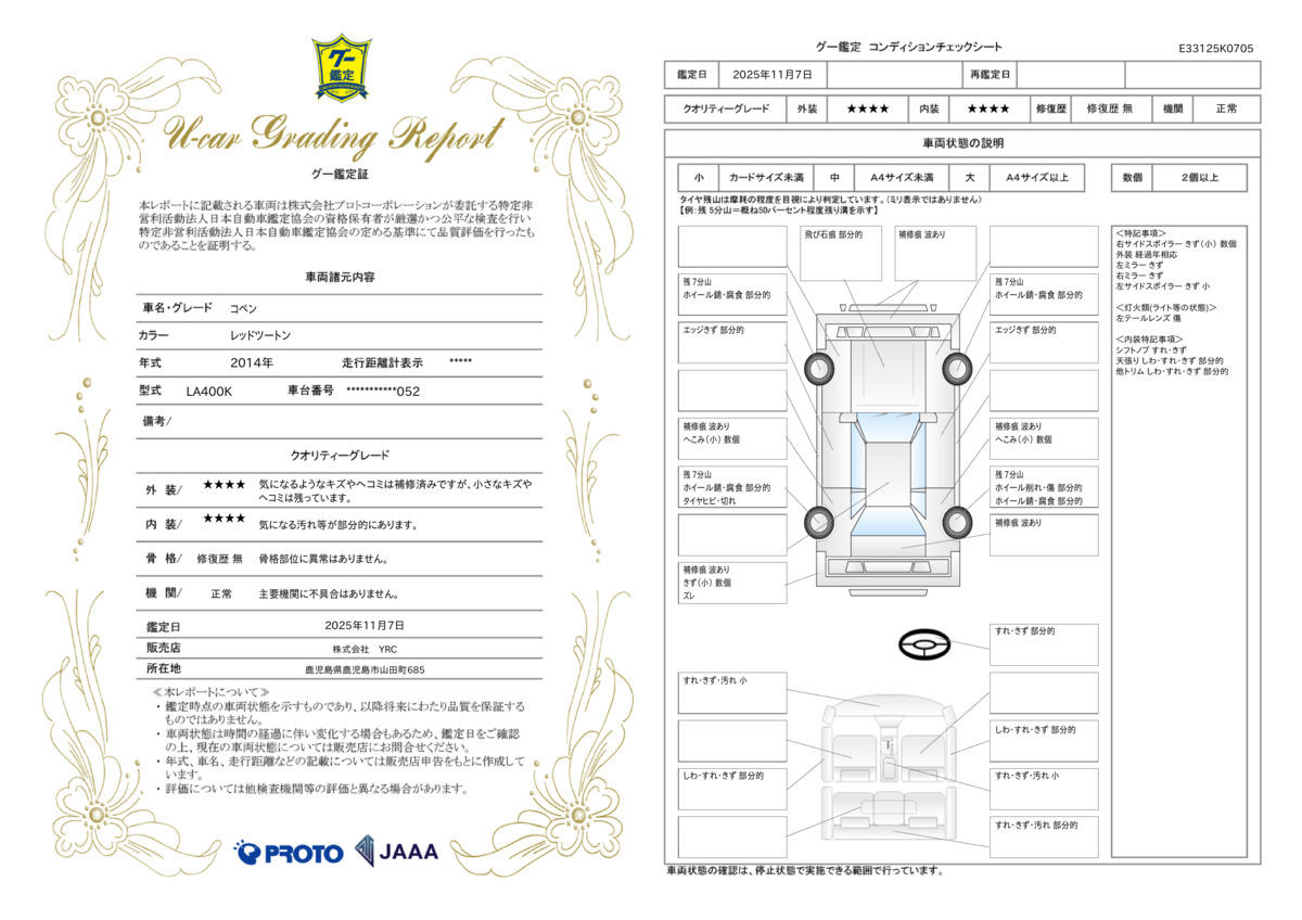 整備時に不良個所は交換しております。不具合が発生した時の為に3か月又は3000km(どちらか早い到達)の保証付です。消耗品や故意又は過失に伴う故障、塗装面の退色等経過年数に伴うものは対象外になります。