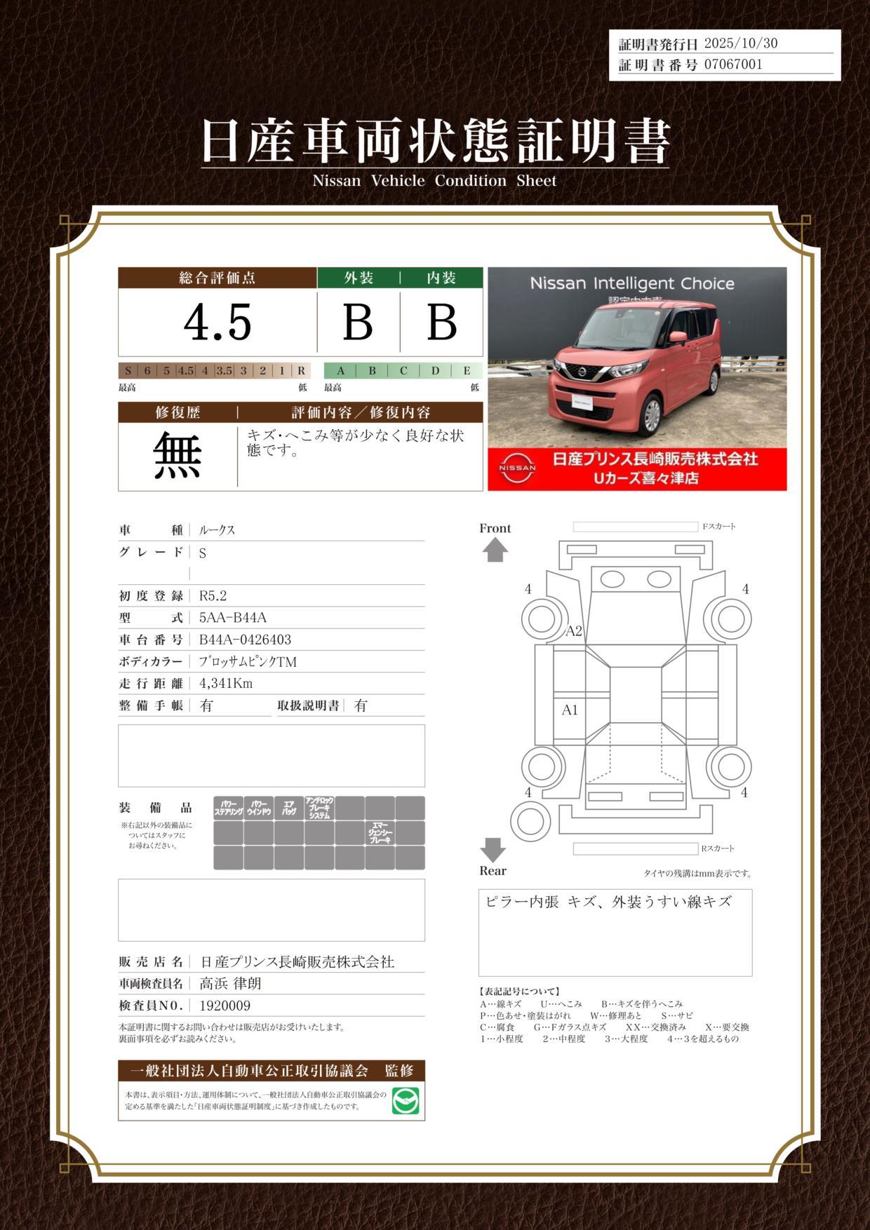 購入いただいたお車には無料保証をお付けしています。1年間(走行距離無制限)の間に、エンジン、ミッション、サスペンション、排出ガス装置、電子制御部品、ブレーキ、シャフト、純正ナビなど主要部品の故障は無償にて修理いたします。詳しくは納車時に保証書をお渡しいたします。