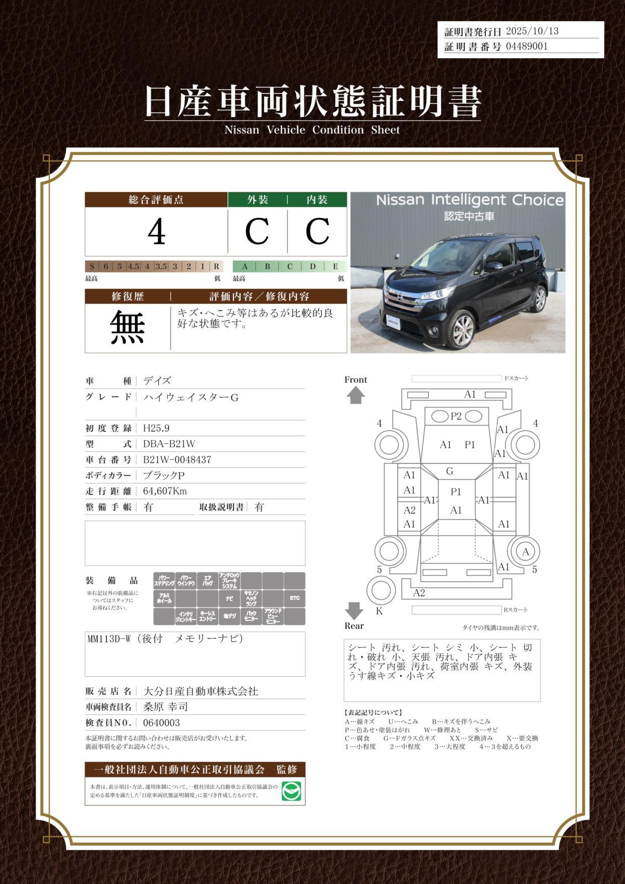 日産 デイズ 660 ハイウェイスターG 日産純正ナビゲーションMM113D−W