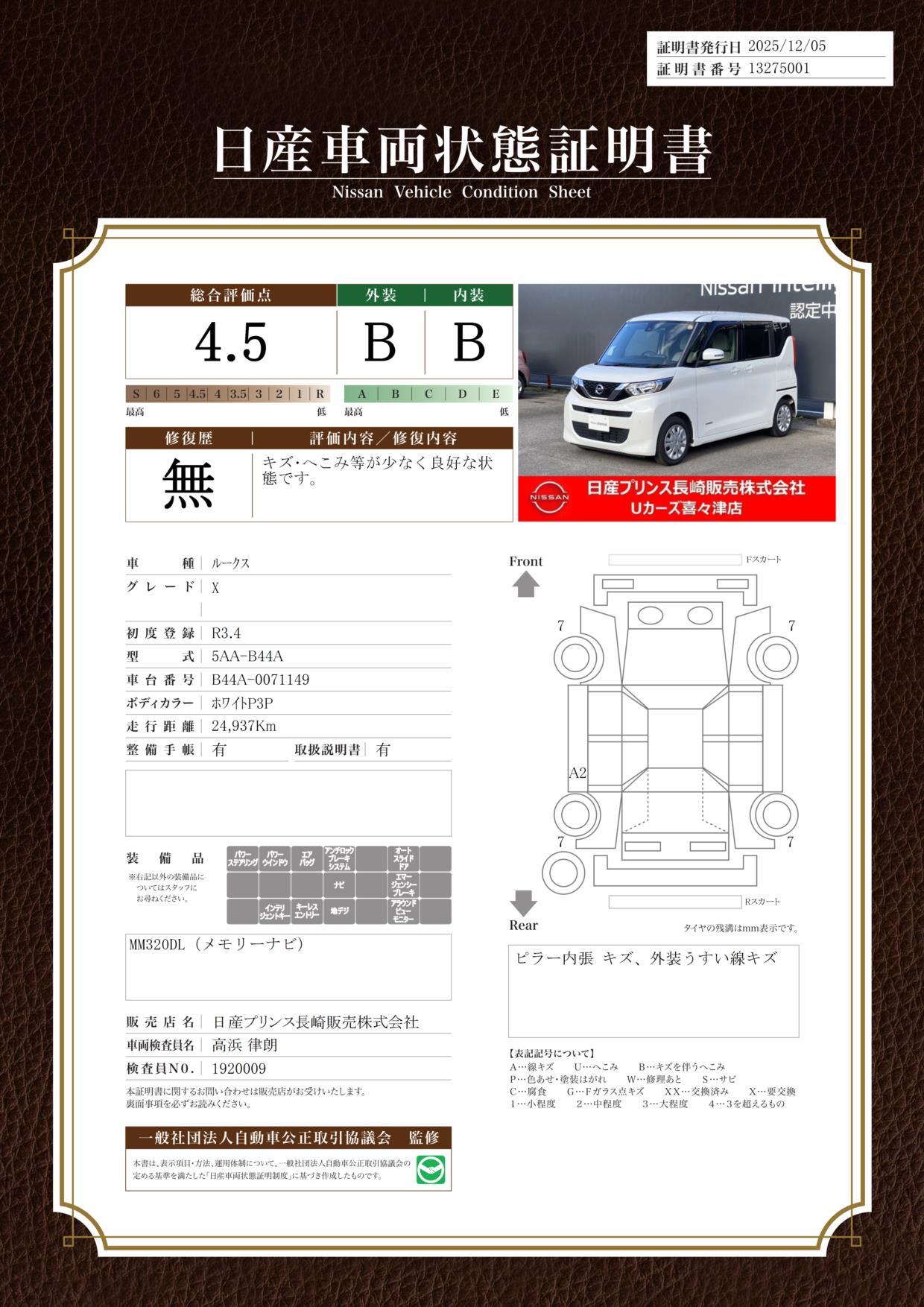 購入いただいたお車には無料保証をお付けしています。1年間(走行距離無制限)の間に、エンジン、ミッション、サスペンション、排出ガス装置、電子制御部品、ブレーキ、シャフト、純正ナビなど主要部品の故障は無償にて修理いたします。詳しくは納車時に保証書をお渡しいたします。