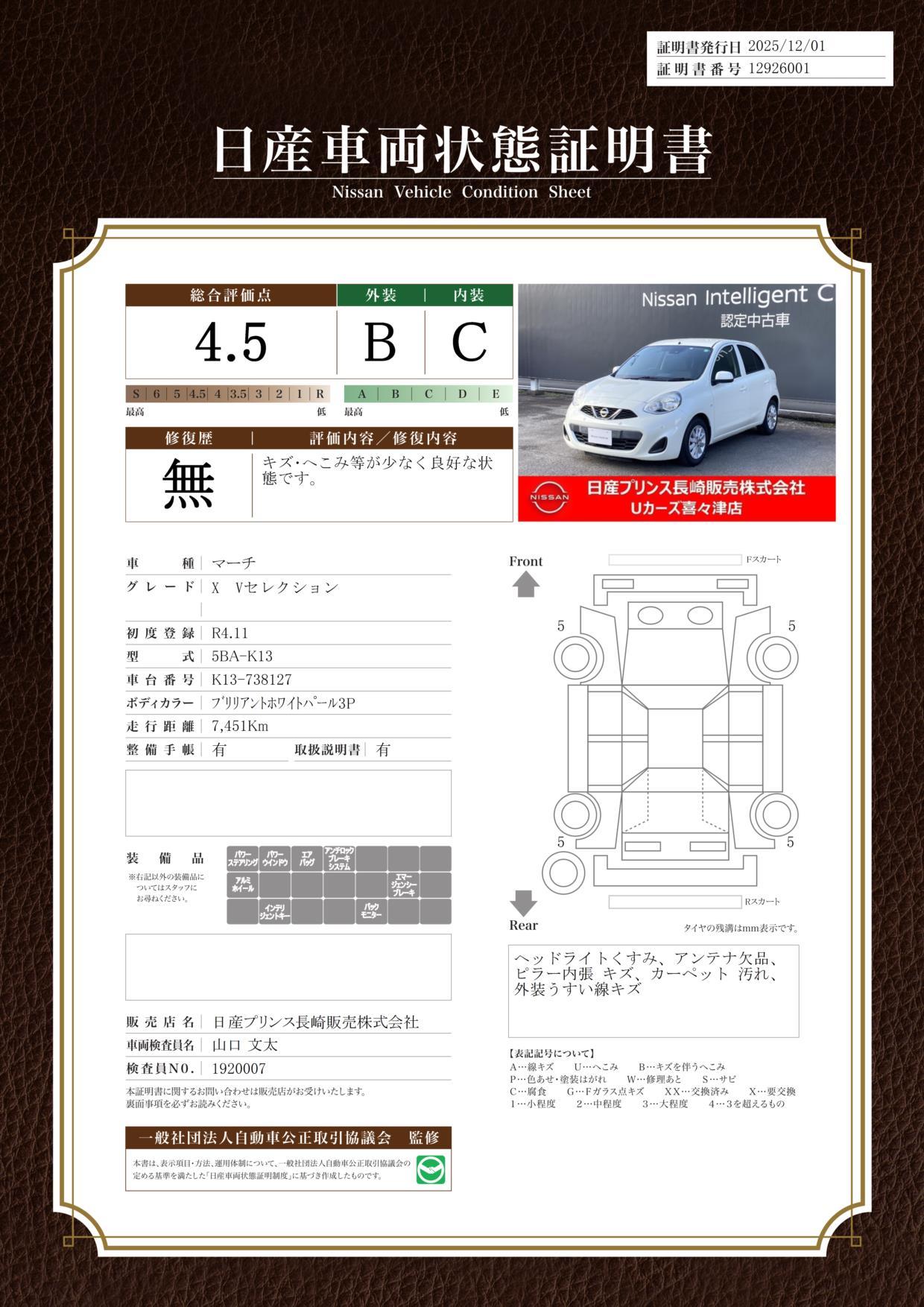 購入いただいたお車には無料保証をお付けしています。1年間(走行距離無制限)の間に、エンジン、ミッション、サスペンション、排出ガス装置、電子制御部品、ブレーキ、シャフト、純正ナビなど主要部品の故障は無償にて修理いたします。詳しくは納車時に保証書をお渡しいたします。