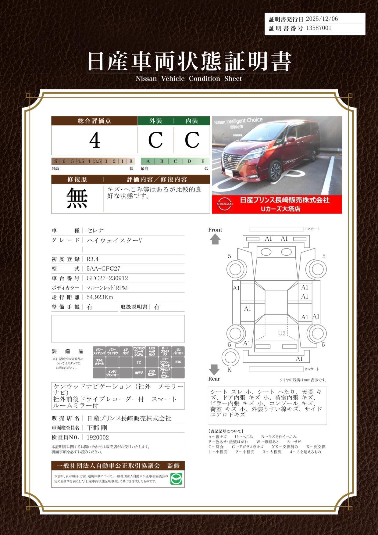 購入いただいたお車には無料保証をお付けしています。1年間(走行距離無制限)の間に、エンジン、ミッション、サスペンション、排出ガス装置、電子制御部品、ブレーキ、シャフト、純正ナビなど主要部品の故障は無償にて修理いたします。詳しくは納車時に保証書をお渡しいたします。
