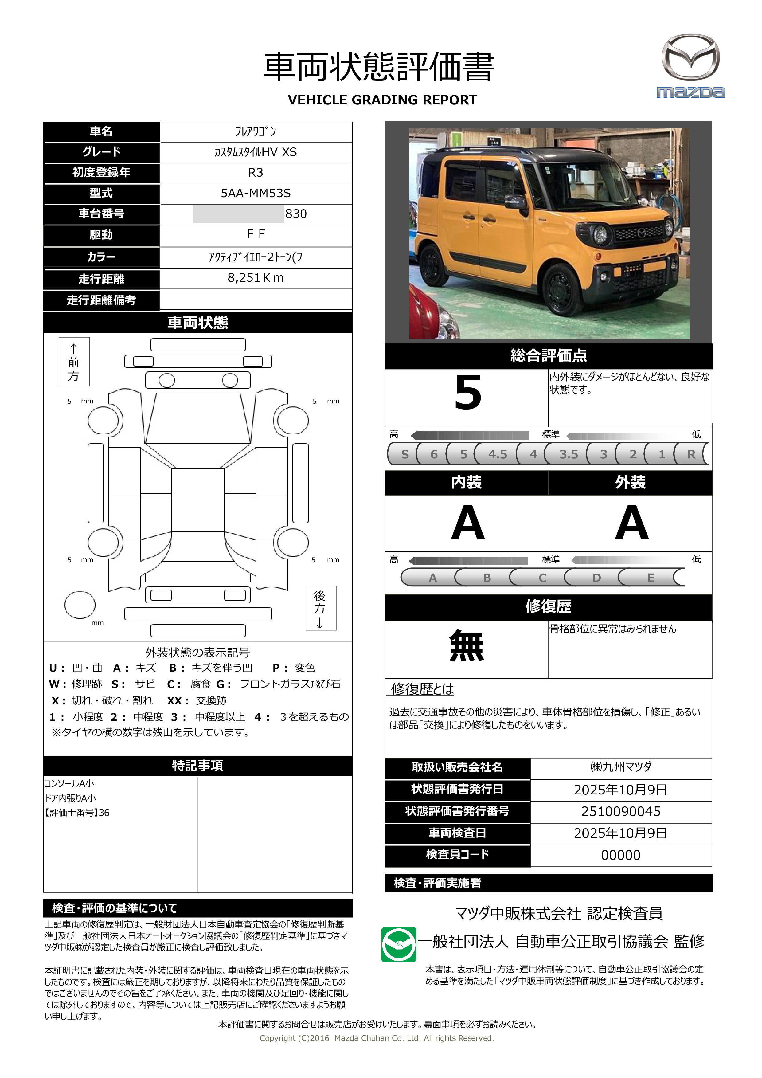 修復歴 なし 車体色 アクティブイエロー2トーン