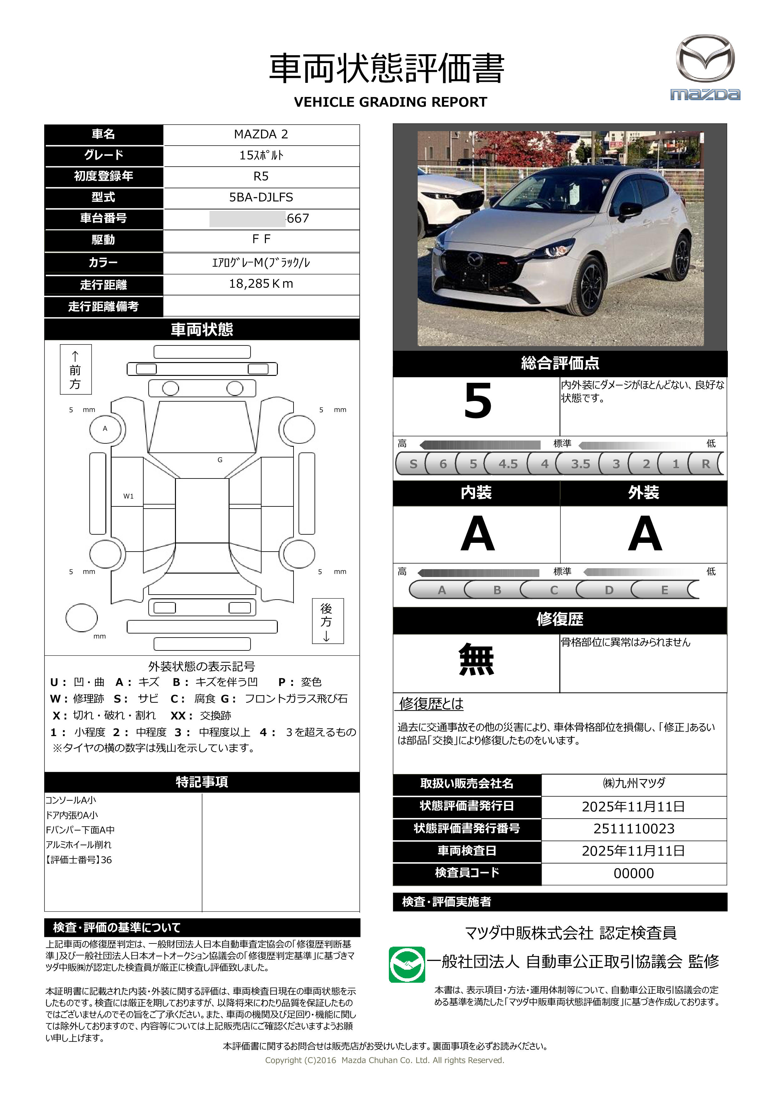 1,第三者機関による車両状態評価書 2,1年間走行距離無制限保証 3,定期点検整備実施 4,7品目の部品交換(点検の結果良好と確認できた部品は交換しない場合も有) 5,1か月無料点検 6,マツダ認定U−car認定証の発行一部の車両(現状販売車)を除き全ての車両価格が「整備費込み」