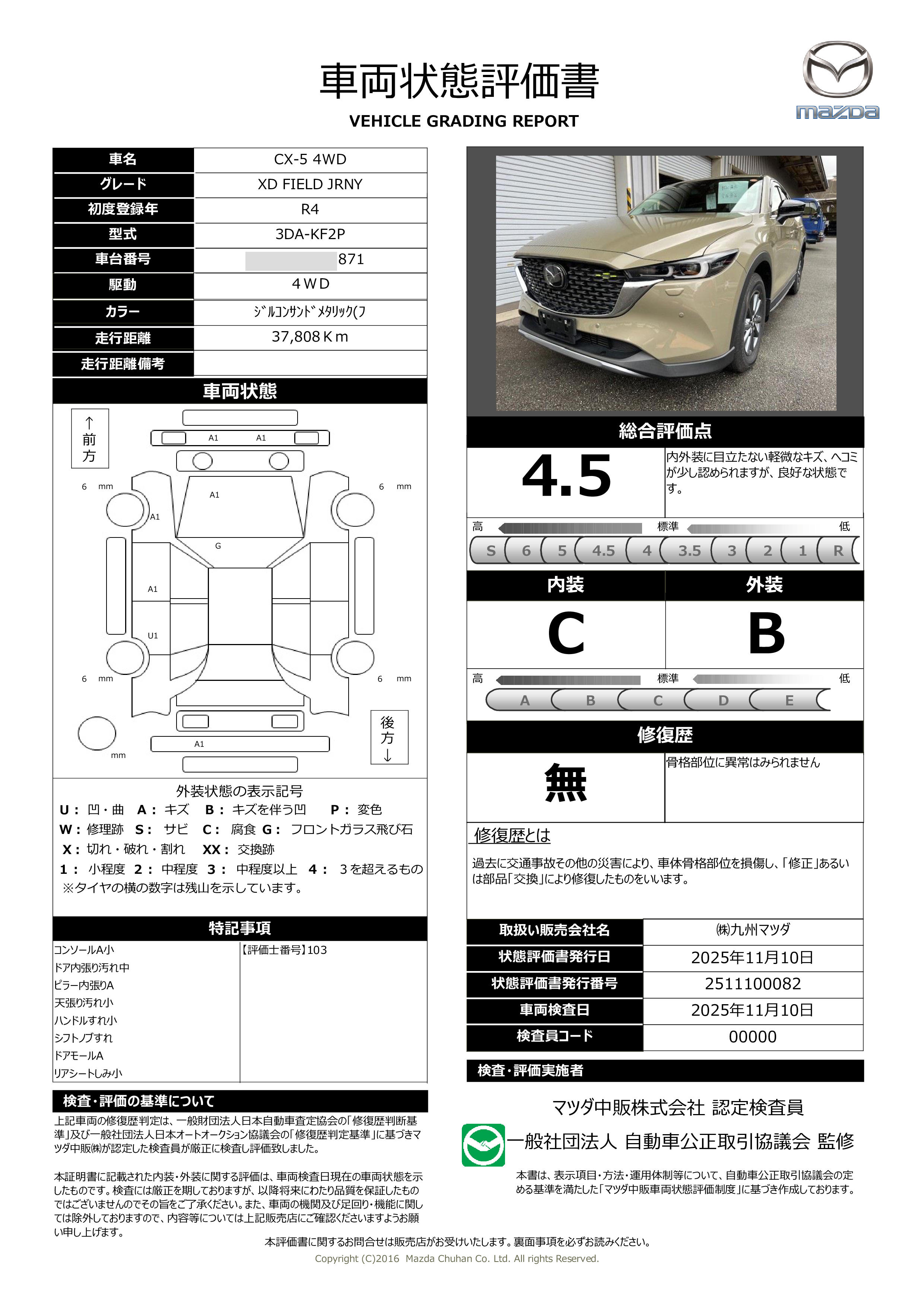 1,第三者機関による車両状態評価書 2,1年間走行距離無制限保証 3,定期点検整備実施 4,7品目の部品交換(点検の結果良好と確認できた部品は交換しない場合も有) 5,1か月無料点検 6,マツダ認定U−car認定証の発行一部の車両(現状販売車)を除き全ての車両価格が「整備費込み」
