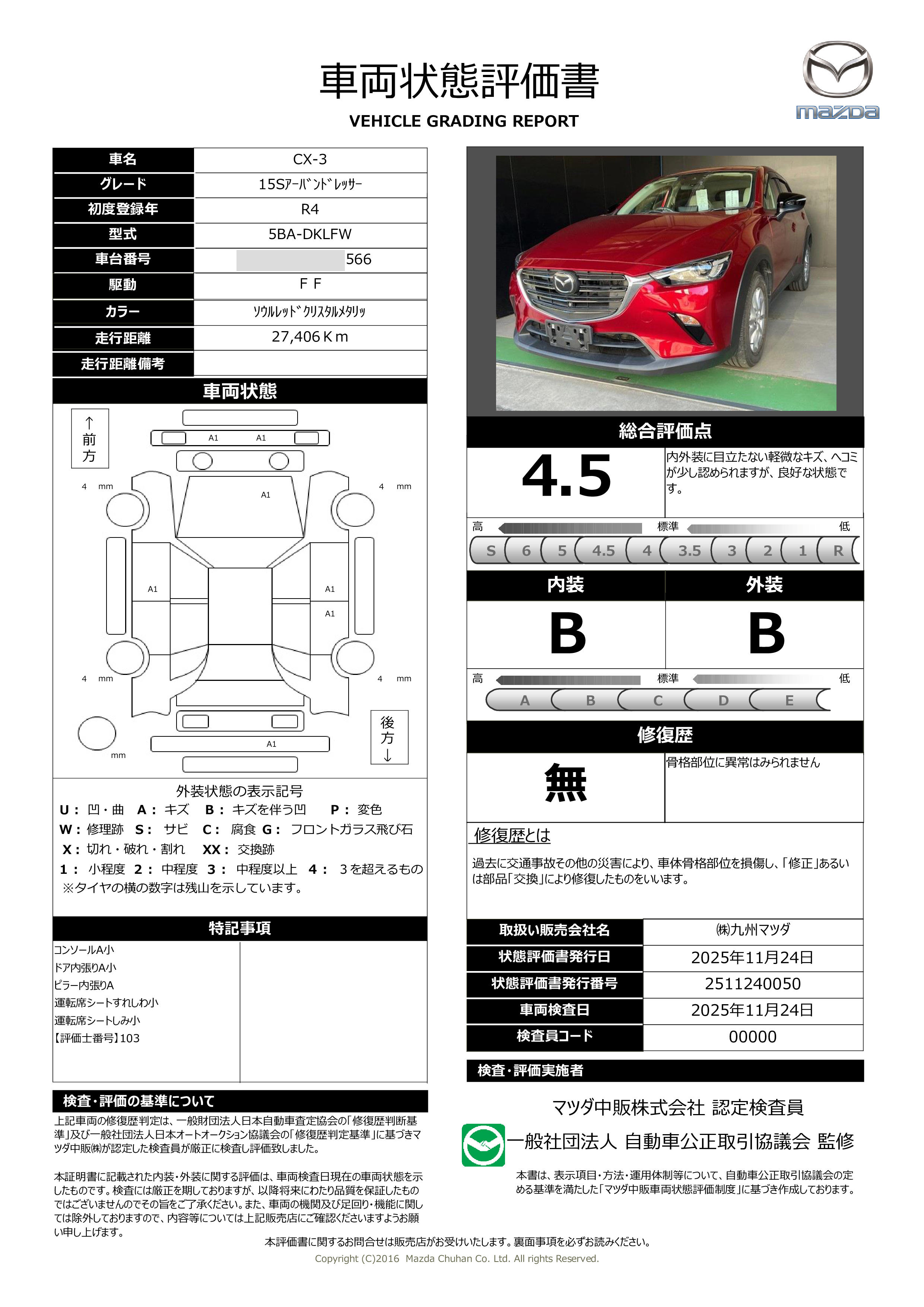 安心の第三者審査機関が監修した「車両状態評価書」付。修復歴・冠水歴・メーター巻き戻し無しです。 25