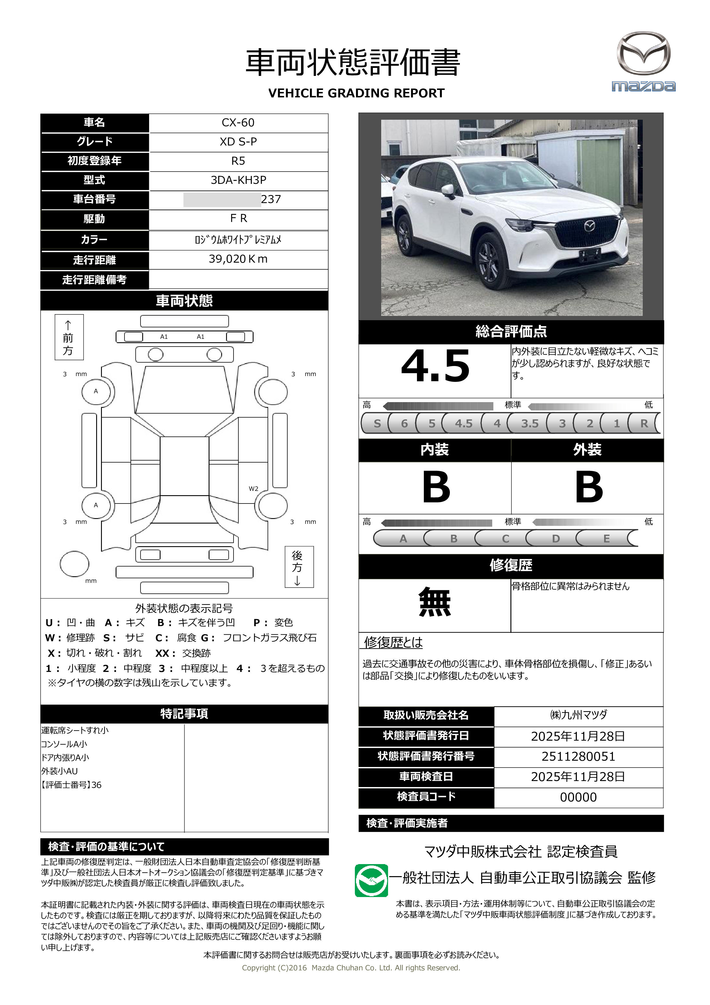 修復歴 なし 車体色 ロジウムホワイトプレミアムメタリック(ブ