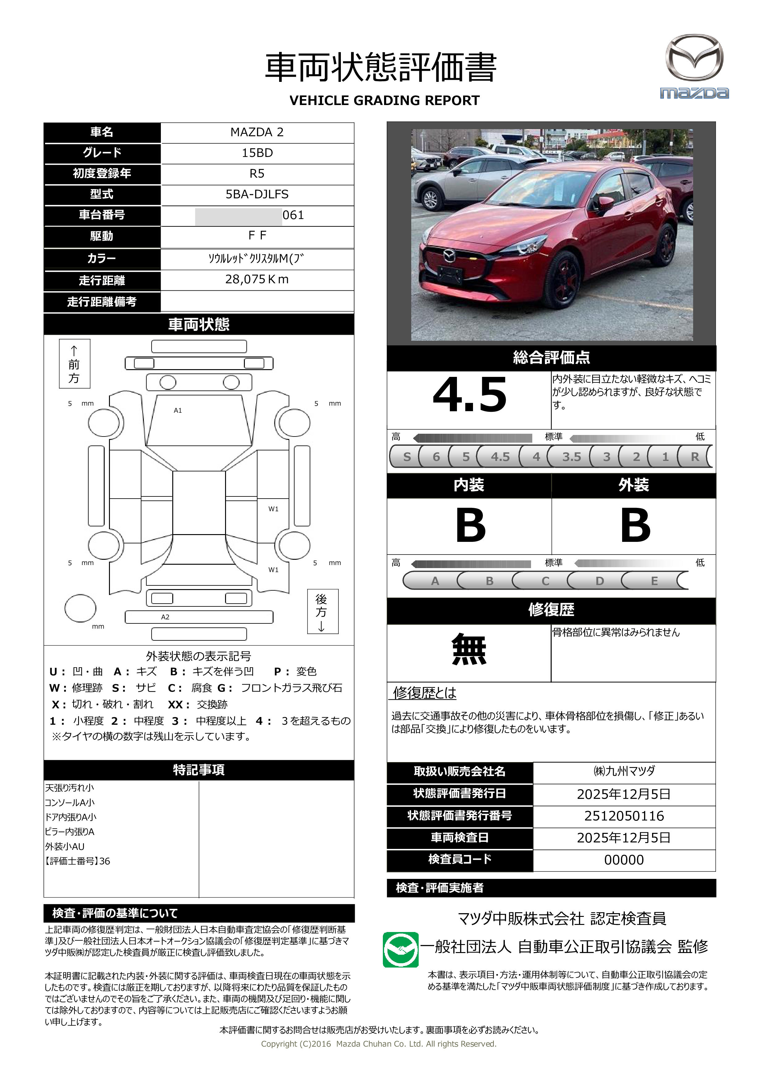 九州マツダでは「本体価格35万円以上」の中古車をご購入のお客様には全車保証期間として納車から1年・走行距離無制限の保証をお付けしております。詳しくはスタッフまでお問い合わせください。