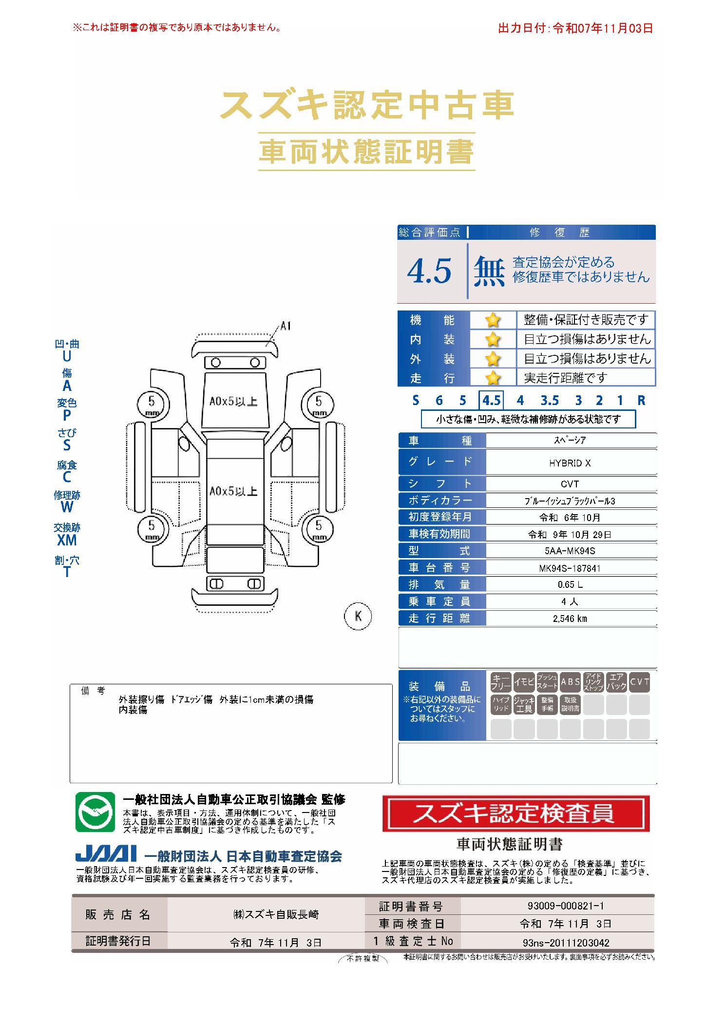 スペーシア HYBRID X OK保証プレミアム付き 車検9年10月 走行3,000キロ 修復歴無し 1