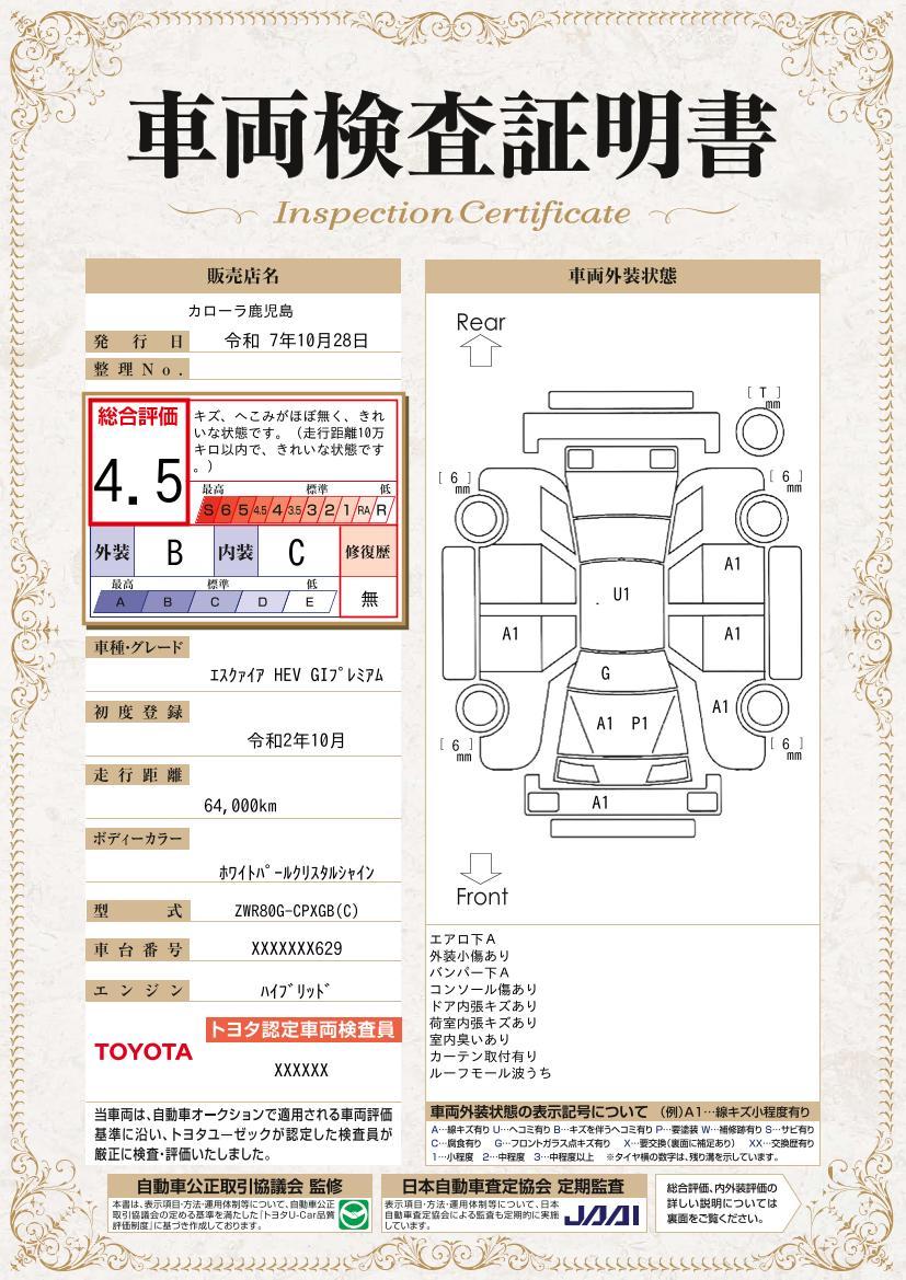 | 保証について | [保証付]:12ヶ月・走行無制限 ロングラン保証1年<走行距離無制限> +ハイブリッド保証<保証期間は初度登録年月から10年目まで、もしくは3年間のいずれか長い方。但し走行距離20万キロまで> |