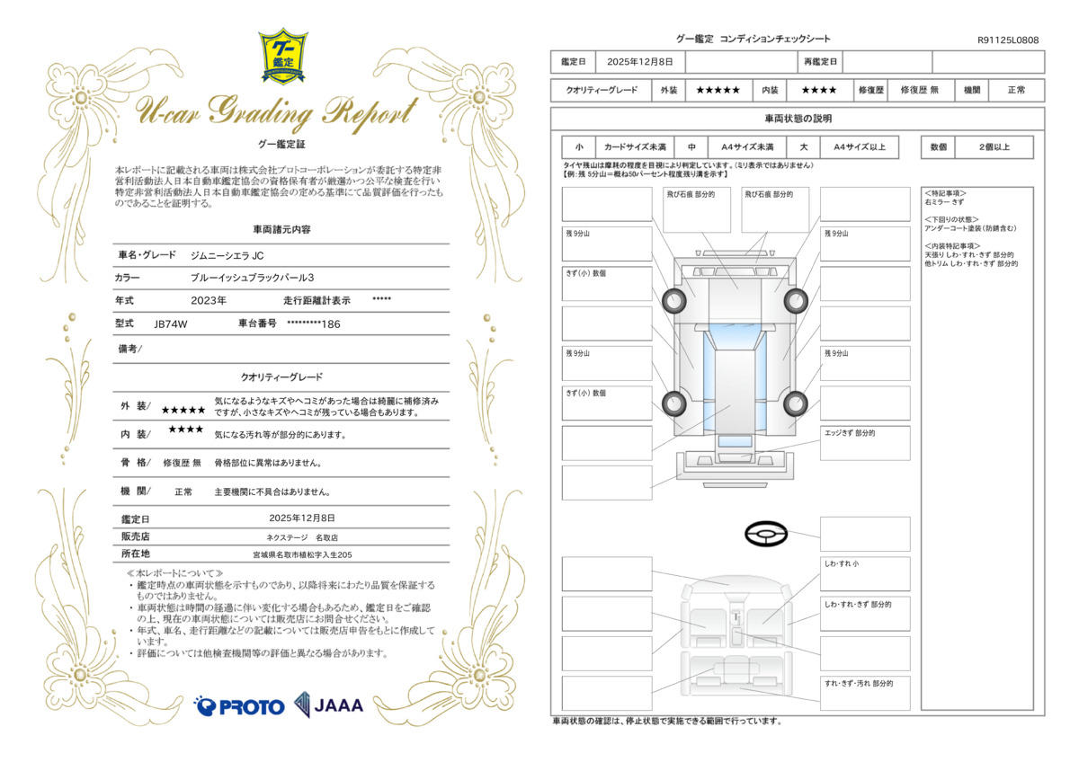 | 保証項目 | 3ヶ月・3000km以内ならエンジン、トランスミッション、ハイブリッド、ステアリング、ブレーキの各機構における主要項目を無償修理(または交換)いたします。 |