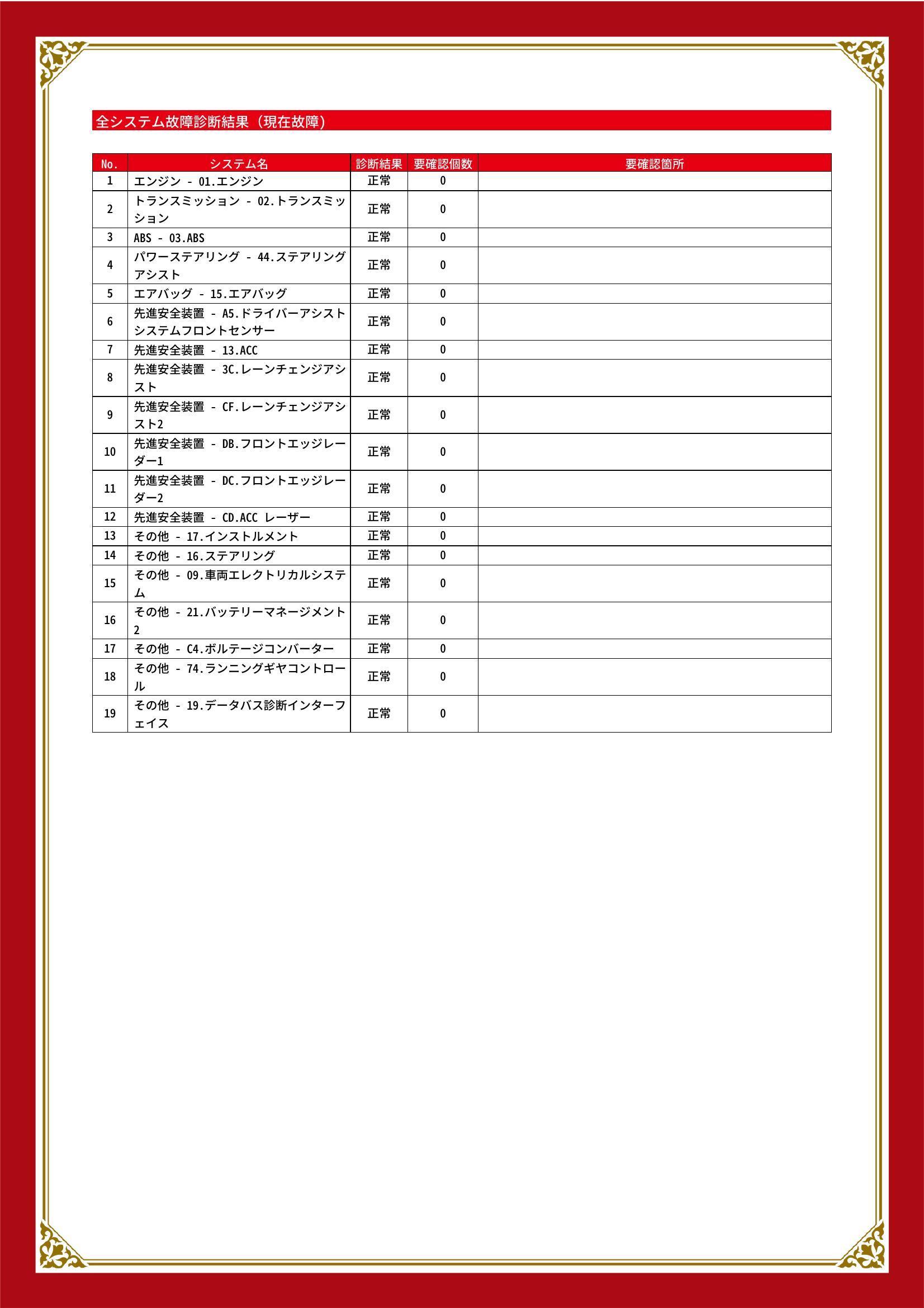 | 保証項目 | 1ヶ月以内なら走行距離無制限にてエンジン、トランスミッション、ハイブリッド、ステアリング、ブレーキの各機構における主要項目を無償修理(または交換)いたします。 |
