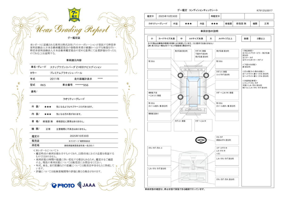 | 保証項目 | 3ヶ月・3000km以内ならエンジン、トランスミッション、ハイブリッド、ステアリング、ブレーキの各機構における主要項目を無償修理(または交換)いたします。 |