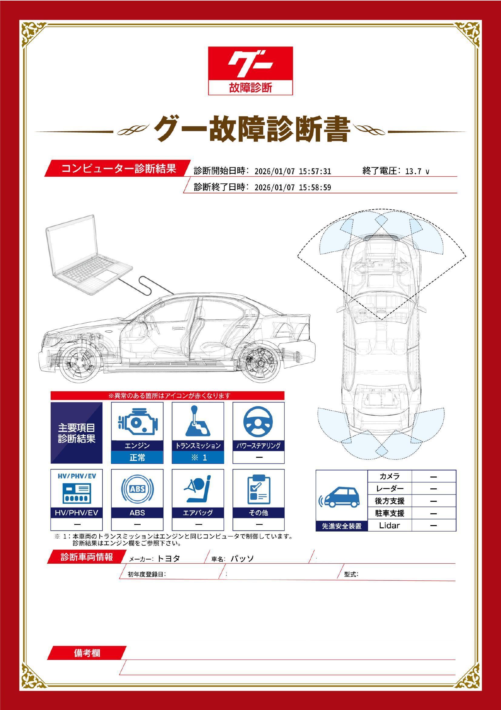 | 保証項目 | 3ヶ月・3000km以内ならエンジン、トランスミッション、ハイブリッド、ステアリング、ブレーキの各機構における主要項目を無償修理(または交換)いたします。 |