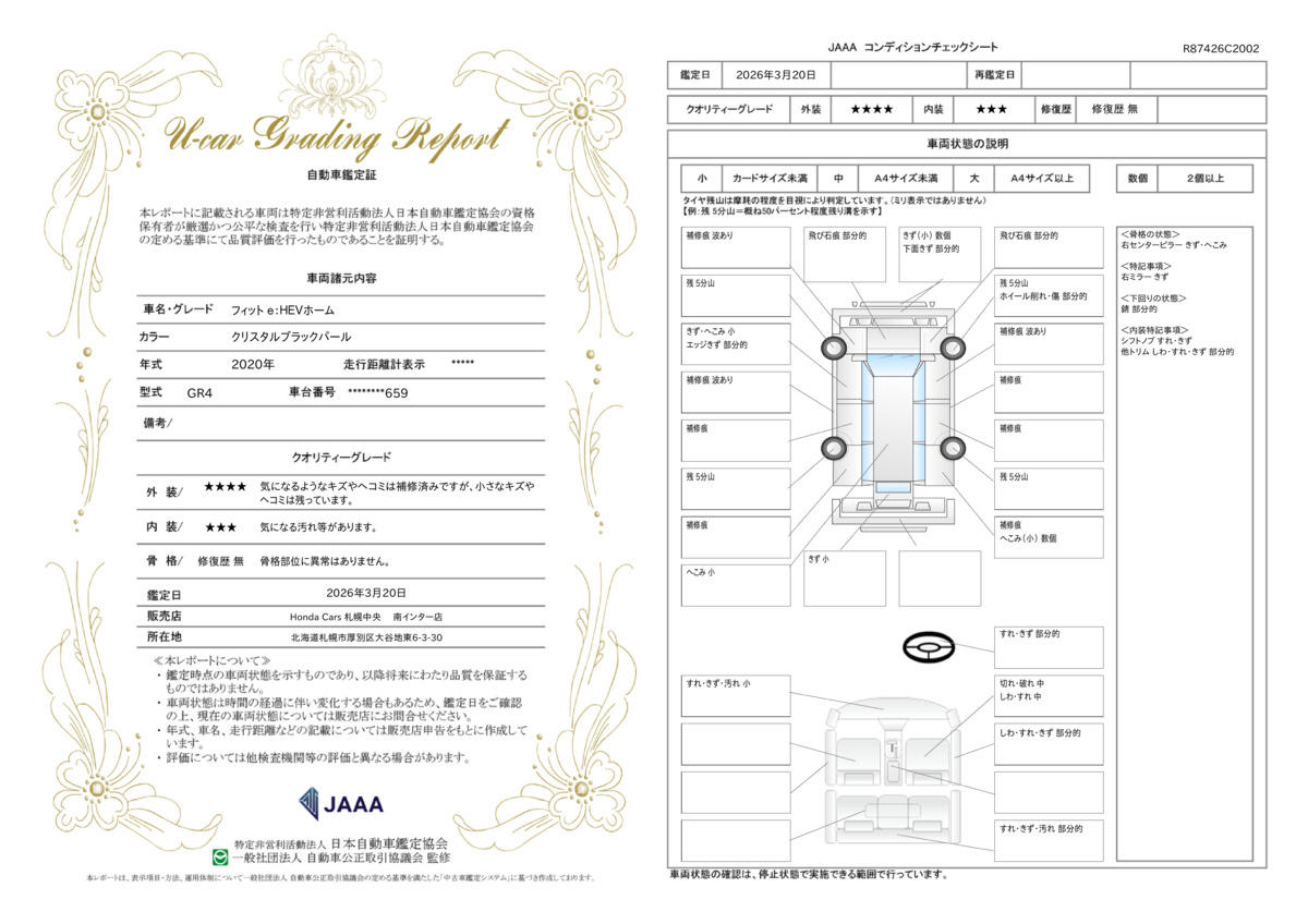 このお車は第三者機関(JAAA)が鑑定を行い、その結果を鑑定証として発行しております。