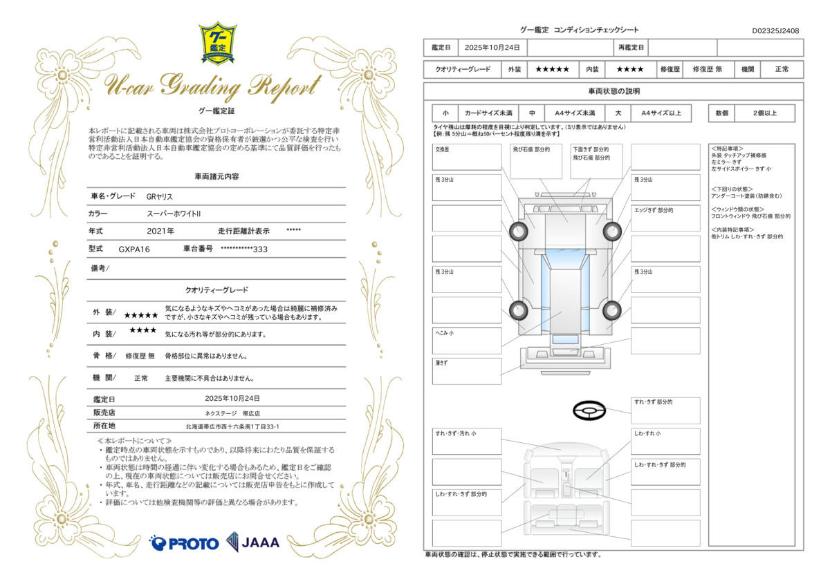 弊社では、全車『修復歴なし』のお車のみ取り扱っております。専任バイヤーによる厳選した仕入れの後、入庫後の車両チェックを行い、ネクステージが認定した高品質な中古車をご提供しております。 15