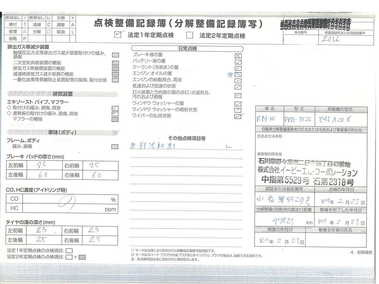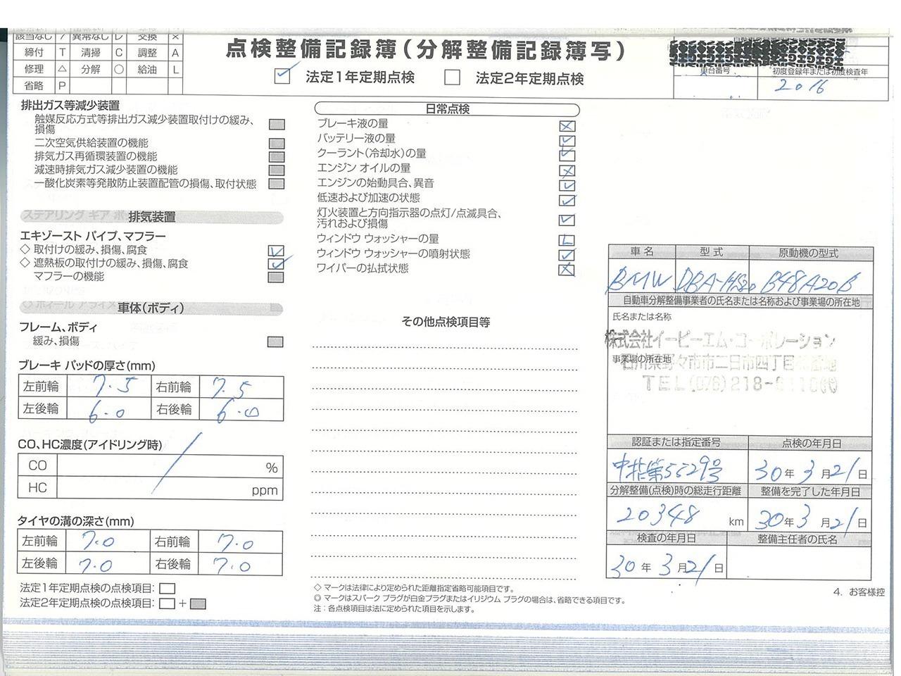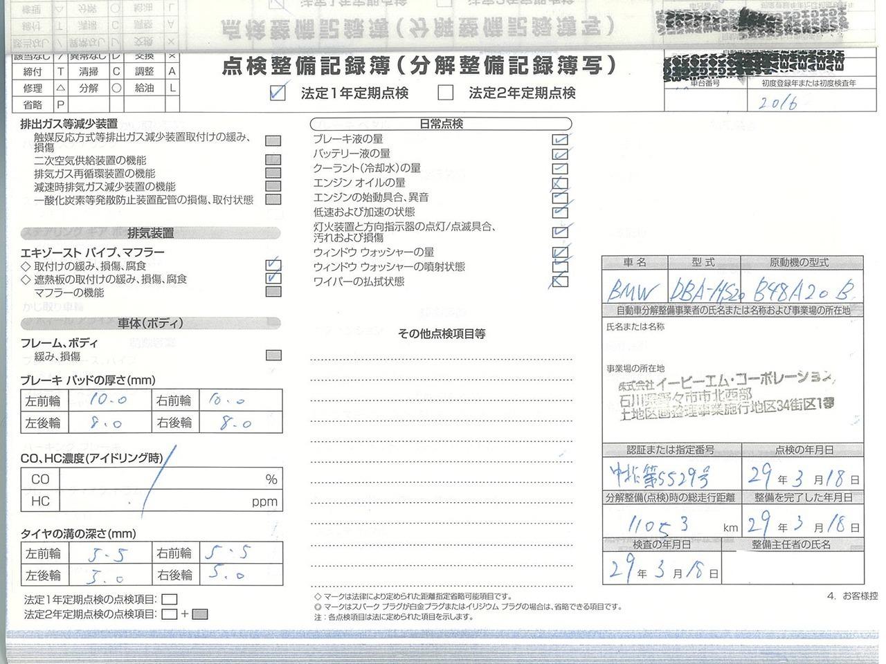 当社はBMWクオリティパートナー認定店です。ご納車前に認証工場にて点検致します。点検整備記録簿も発行致します。 |