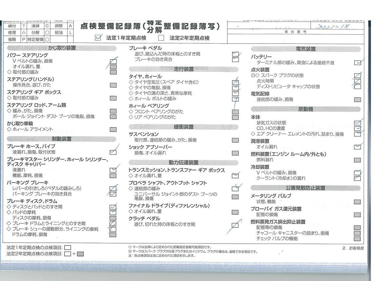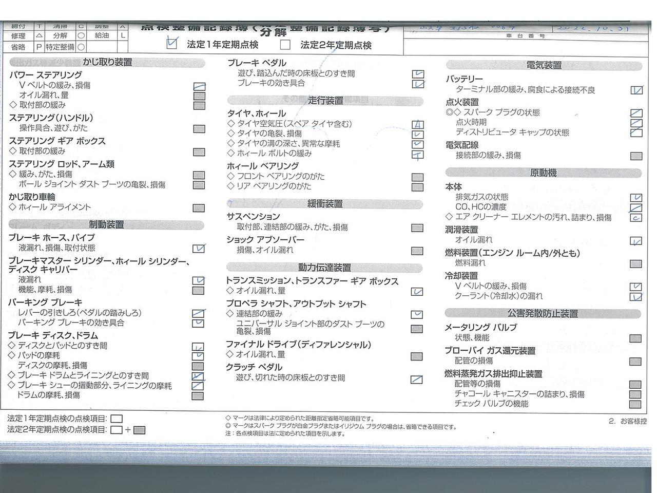 整備付 ご契約後からご納車までに認証工場にて法定点検を実施致します。点検費用は支払総額に含まれております。点検整備記録簿を発行致します。 |