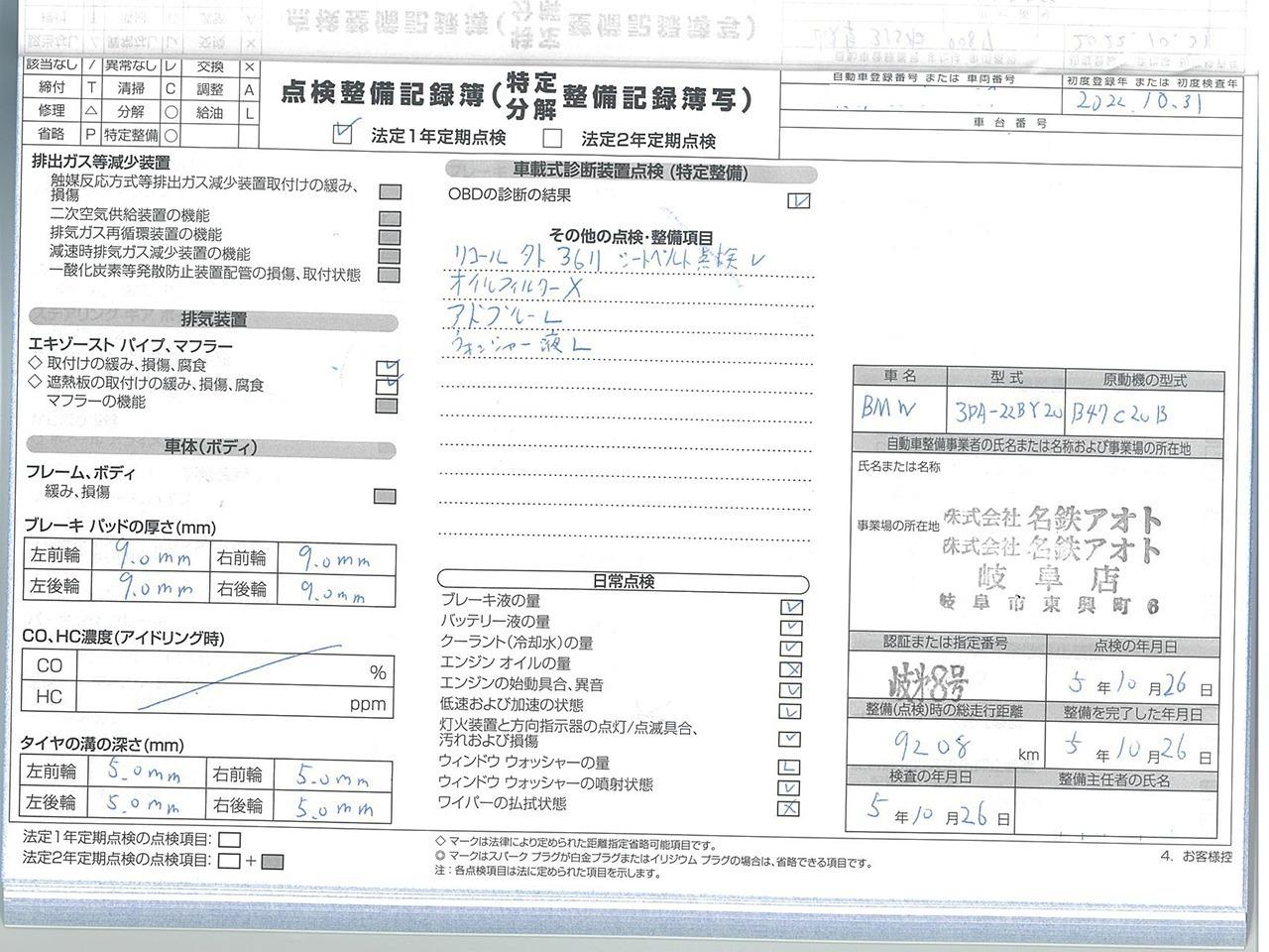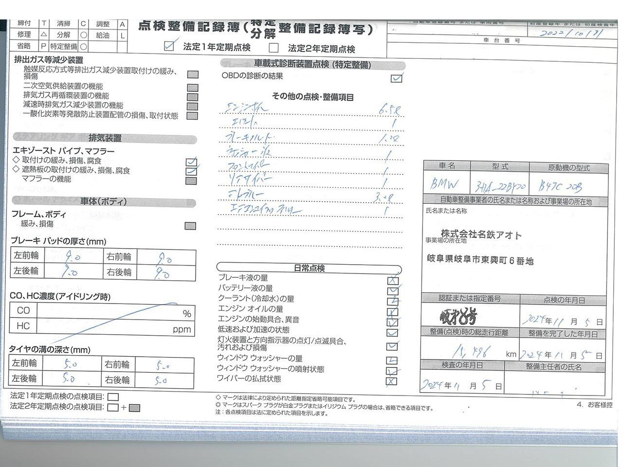 当社はBMWクオリティパートナー認定店です。ご納車前に認証工場にて点検致します。点検整備記録簿も発行致します。 |
