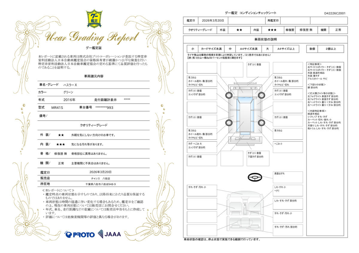 | 保証項目 | 中古車をご購入いただいたお客様に対し、弊社は納車日から1ヶ月間、もしくは走行距離が1500kmに達するまで、無料保証を提供しております。 |