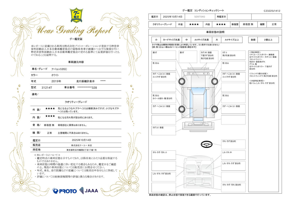 ケーユーでは修復歴の有無を全車に表示。公的機関「(財)日本自動車査定協会」の基準を採用。日本オートオークション協議会「走行距離管理システム」で距離に不正が無いかもチェック済みです。 15