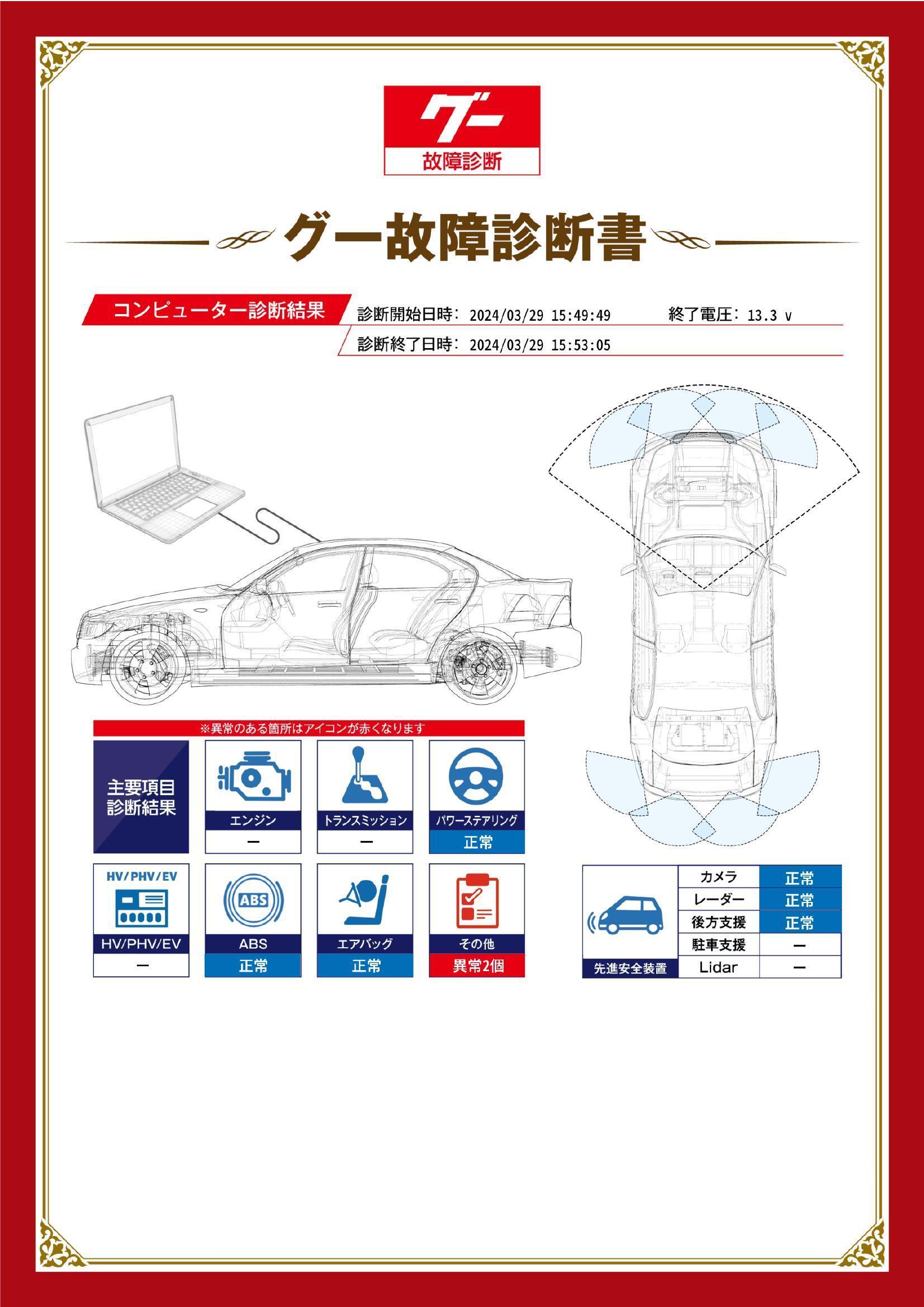保証項目 3ヶ月・3000km以内ならエンジン、トランスミッション、ハイブリッド、ステアリング、ブレーキの各機構における主要項目を無償修理(または交換)いたします。