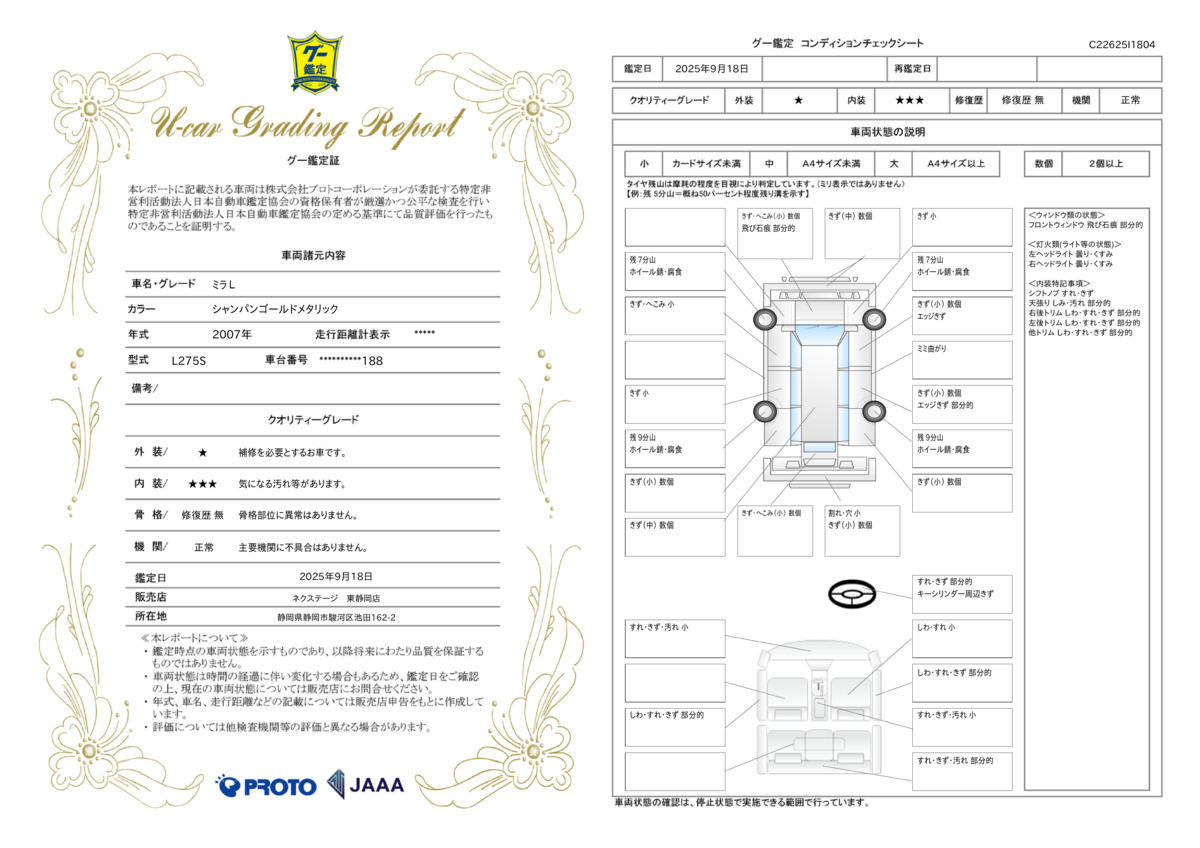 弊社では、全車『修復歴なし』のお車のみ取り扱っております。専任バイヤーによる厳選した仕入れの後、入庫後の車両チェックを行い、ネクステージが認定した高品質な中古車をご提供しております。 15