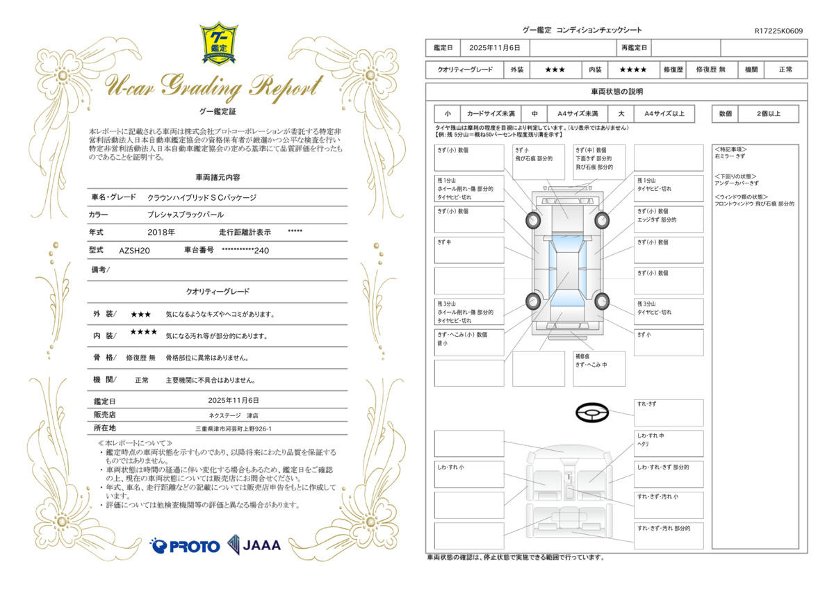 | 保証項目 | 3ヶ月・3000km以内ならエンジン、トランスミッション、ハイブリッド、ステアリング、ブレーキの各機構における主要項目を無償修理(または交換)いたします。 |