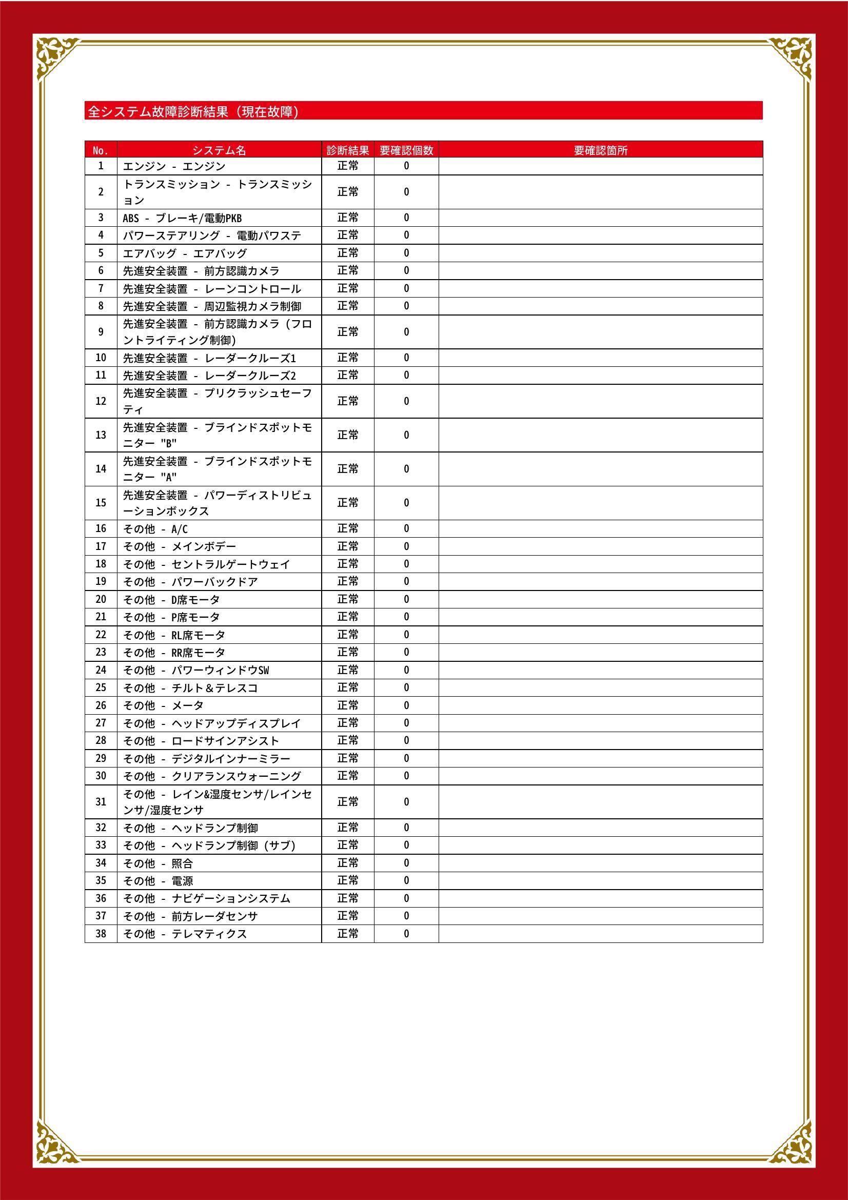 | 保証項目 | 3ヶ月・3000km以内ならエンジン、トランスミッション、ハイブリッド、ステアリング、ブレーキの各機構における主要項目を無償修理(または交換)いたします。 |