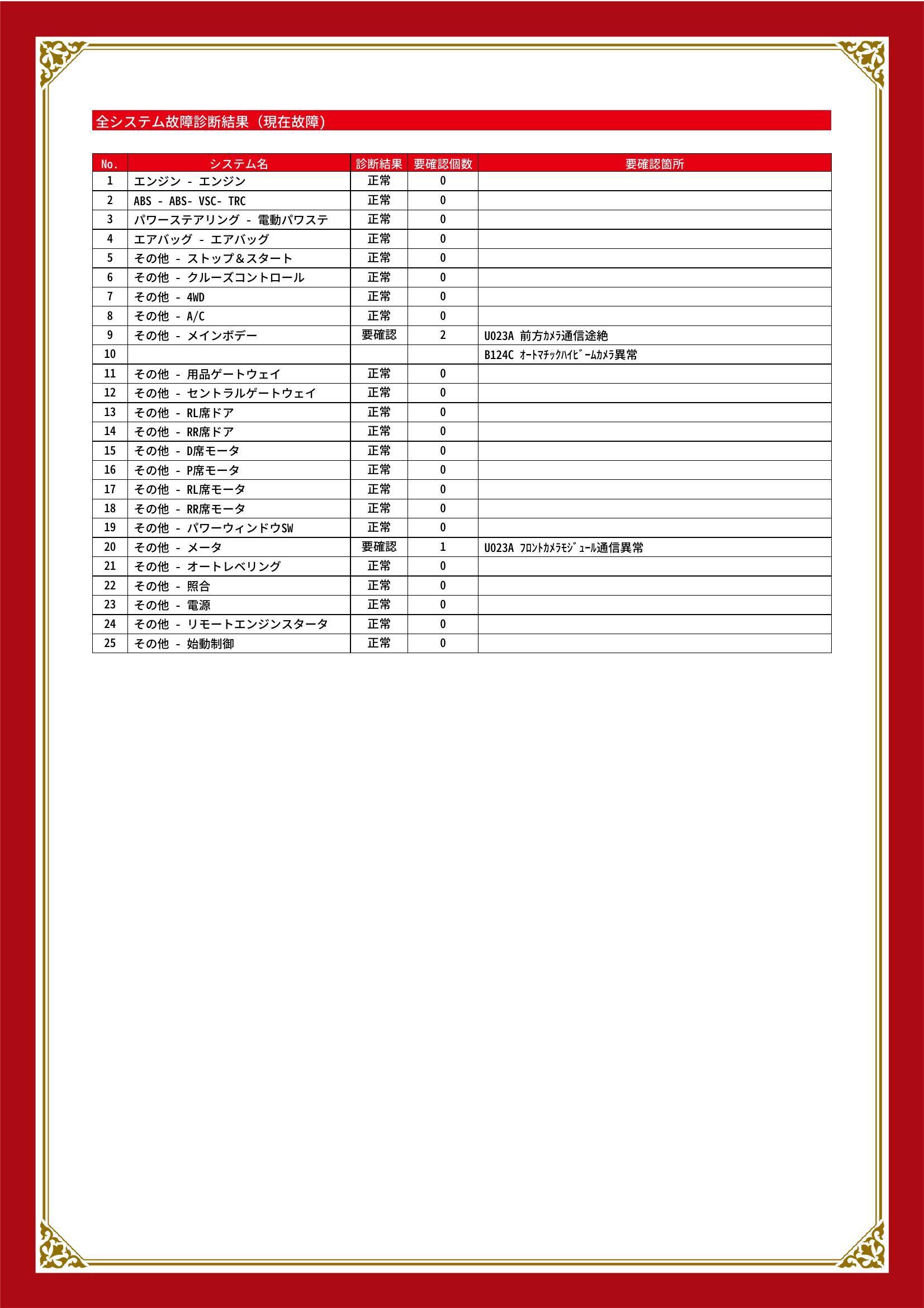 | 保証項目 | その他、スタンダード・プラチナ保証をご用意。【スタンダード・プラチナ保証】では対象項目が業界最高水準の400部位以上!消耗品以外は保証にてご対応出来ます。詳細は店舗へお問い合わせください! |