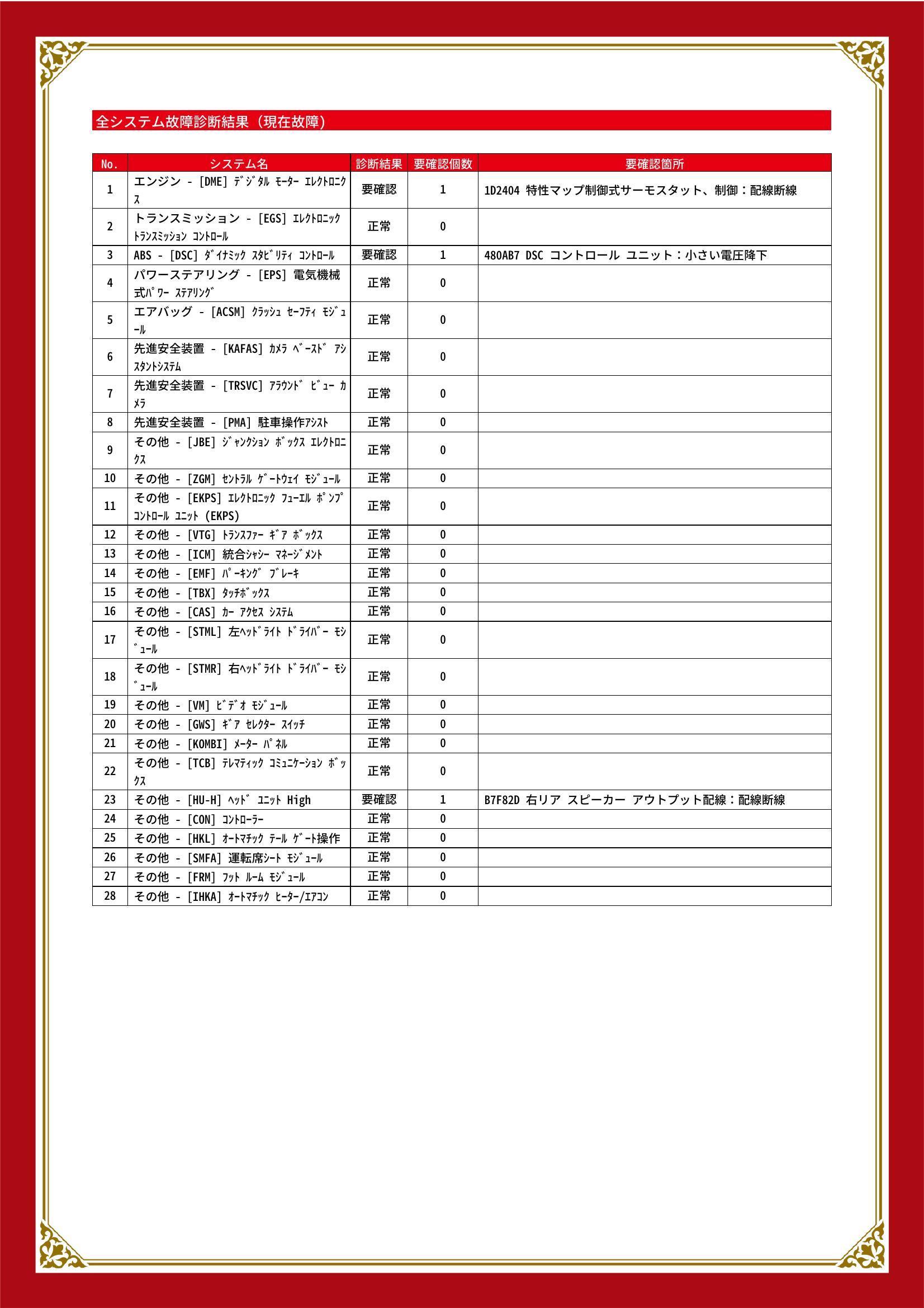 | 保証項目 | ■消耗品、油脂類、外装は保証対象外 全ての消耗部品の補充、交換に要する費用(例:ベルト類、ブレーキディスク・パッド、電球の交換等)は保証修理に含まれません |
