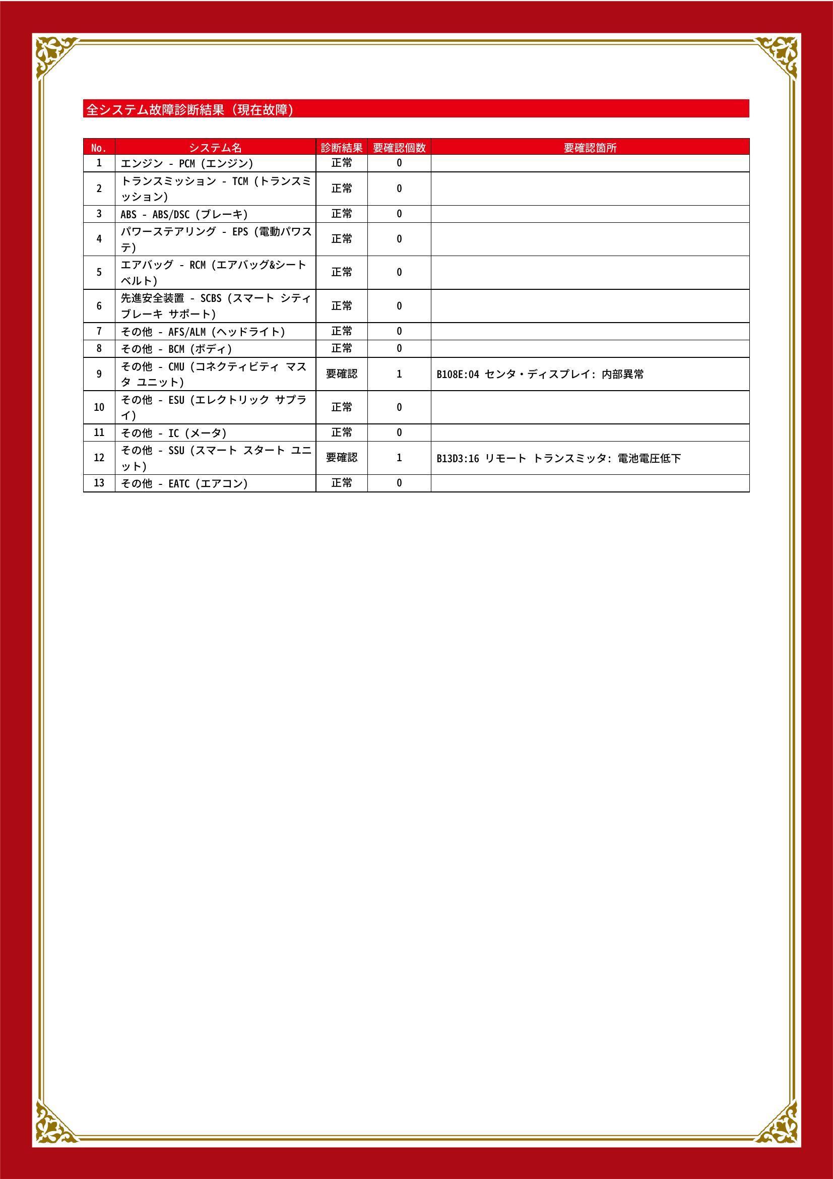 | 保証項目 | その他、スタンダード・プラチナ保証をご用意。【スタンダード・プラチナ保証】では対象項目が業界最高水準の400部位以上!消耗品以外は保証にてご対応出来ます。詳細は店舗へお問い合わせください! |