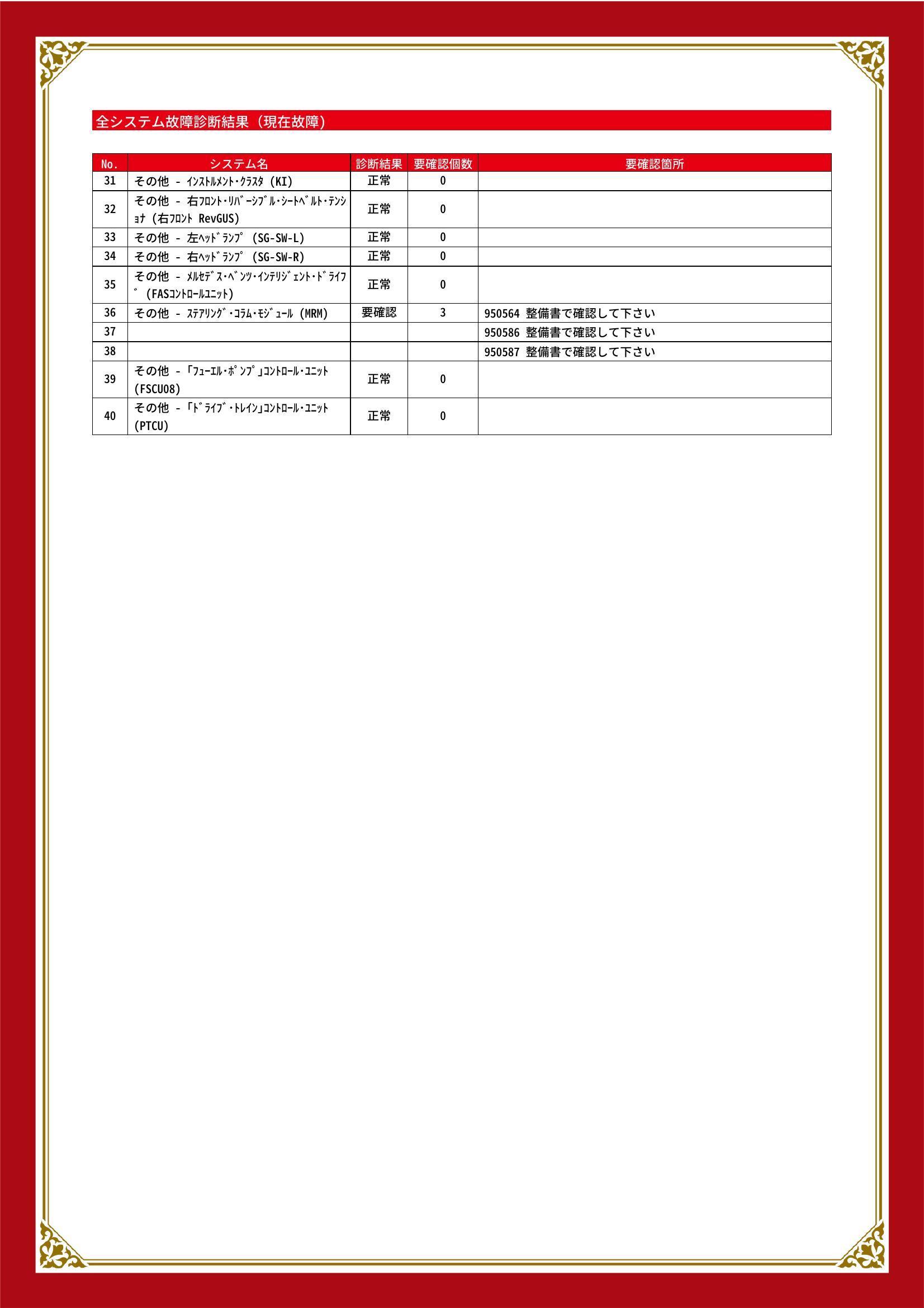 | 保証項目 | ■消耗品、油脂類、外装は保証対象外 全ての消耗部品の補充、交換に要する費用(例:ベルト類、ブレーキディスク・パッド、電球の交換等)は保証修理に含まれません |
