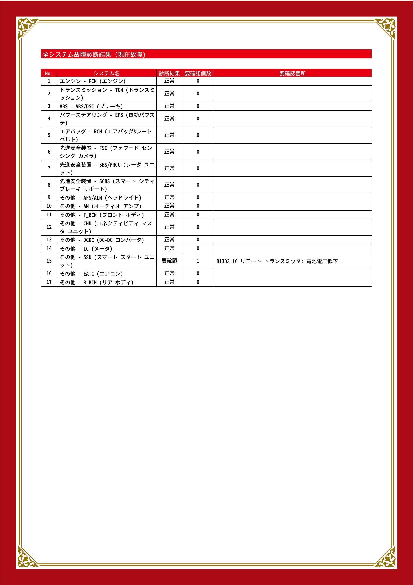 | 保証項目 | その他、スタンダード・プラチナ保証をご用意。【スタンダード・プラチナ保証】では対象項目が業界最高水準の400部位以上!消耗品以外は保証にてご対応出来ます。詳細は店舗へお問い合わせください! |