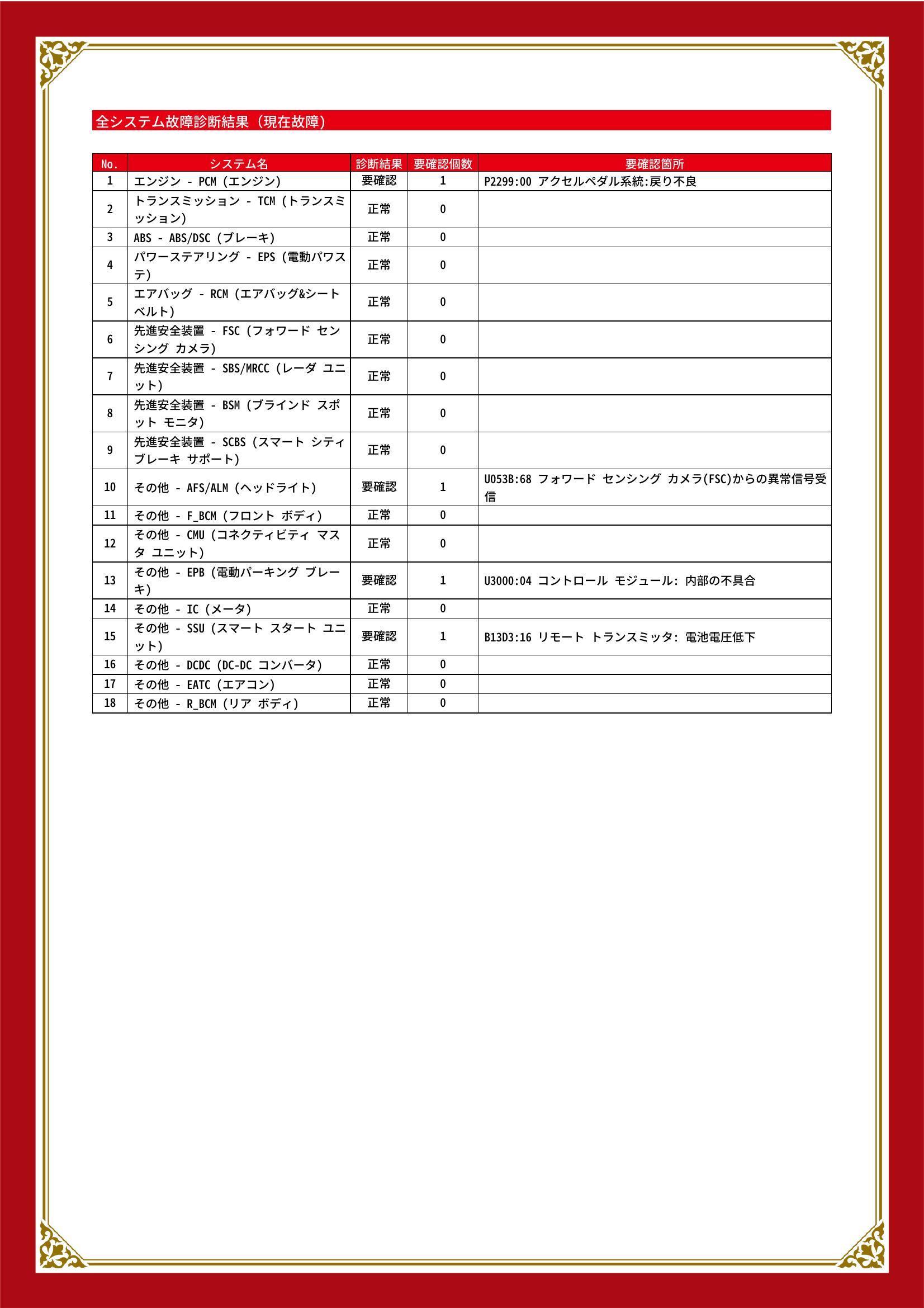 | 保証項目 | その他、スタンダード・プラチナ保証をご用意。【スタンダード・プラチナ保証】では対象項目が業界最高水準の400部位以上!消耗品以外は保証にてご対応出来ます。詳細は店舗へお問い合わせください! |