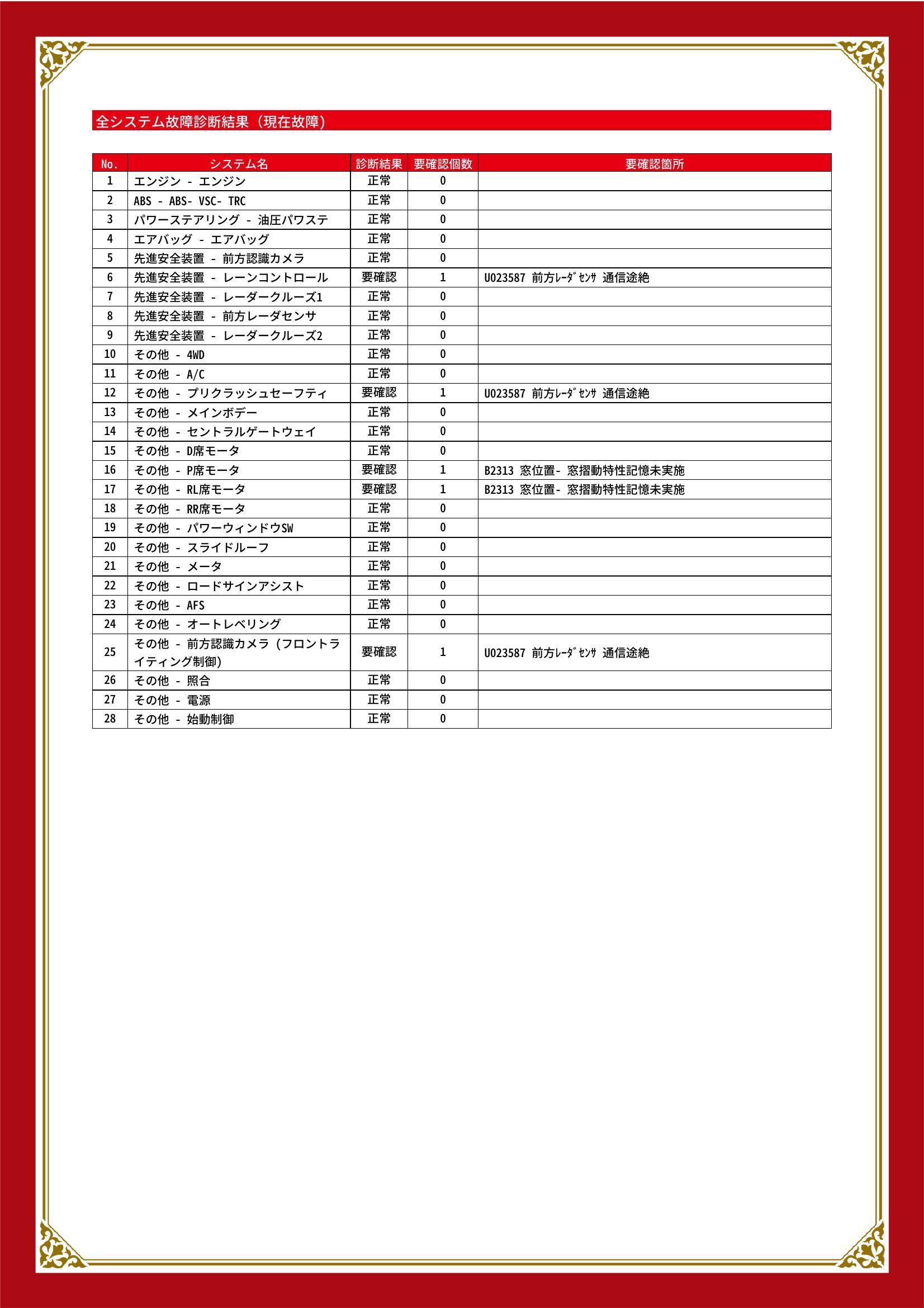 保証項目 | 消耗品、内外装部品を除く機能部品をすべて保証いたします。詳しくはお問い合わせください。 |