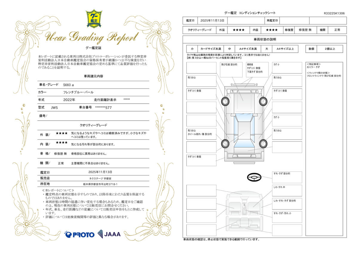 弊社では、全車『修復歴なし』のお車のみ取り扱っております。専任バイヤーによる厳選した仕入れの後、入庫後の車両チェックを行い、ネクステージが認定した高品質な中古車をご提供しております。 16