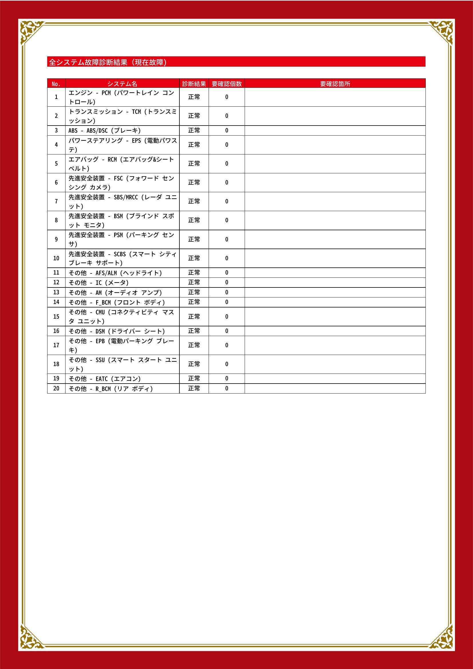 | 保証項目 | 標準でお付けしている3か月3千KMの保証に加えご希望により15年まで延長が可能です。日本全国対応可能!遠方の方でも安心です!24時間のロードサービスも付いてます。万が一の時でも安心頂ける保証内容! |