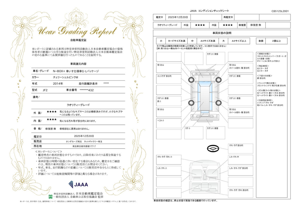 納車前の車検・点検費用に保証費用・当社登録手数料・車庫証証明費用に登録車の場合には自動車税未経過分も含まれております。さらに第三者機関による内外装について車両状態証明書を取得しており安心です 23