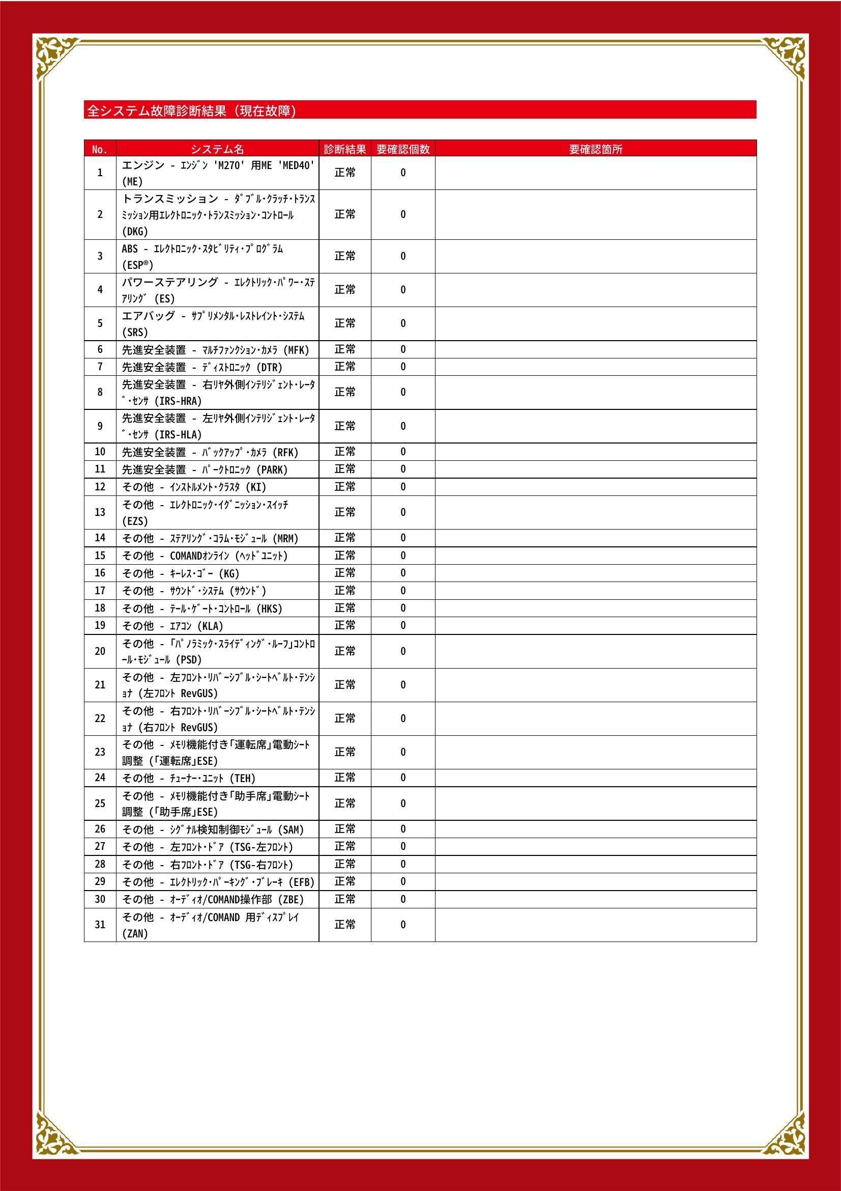 保証項目 | 1ヶ月以内なら走行距離無制限にてエンジン、トランスミッション、ハイブリッド、ステアリング、ブレーキの各機構における主要項目を無償修理(または交換)いたします。 |