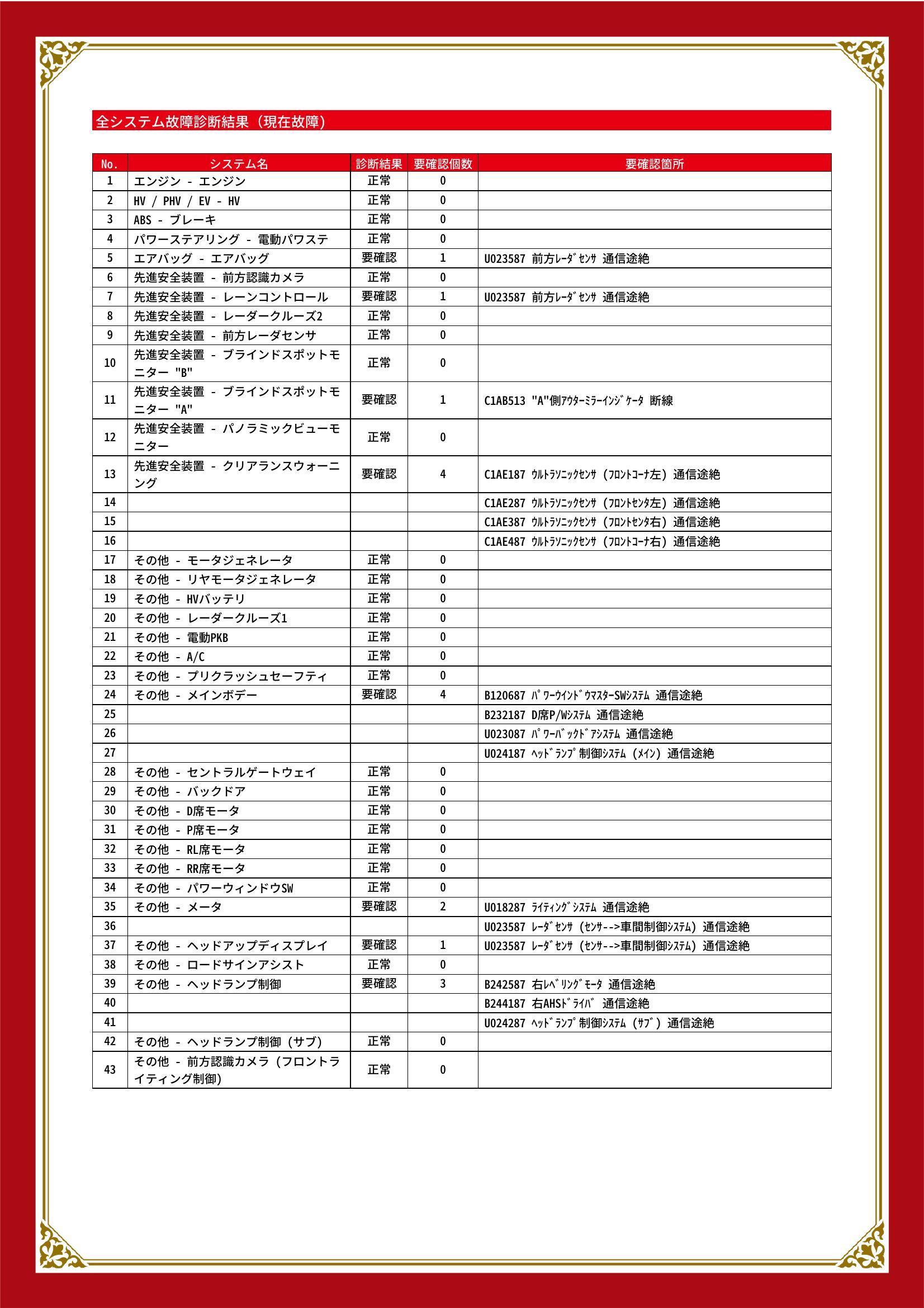 | 保証項目 | 3ヶ月・3000km以内ならエンジン、トランスミッション、ハイブリッド、ステアリング、ブレーキの各機構における主要項目を無償修理(または交換)いたします。 |