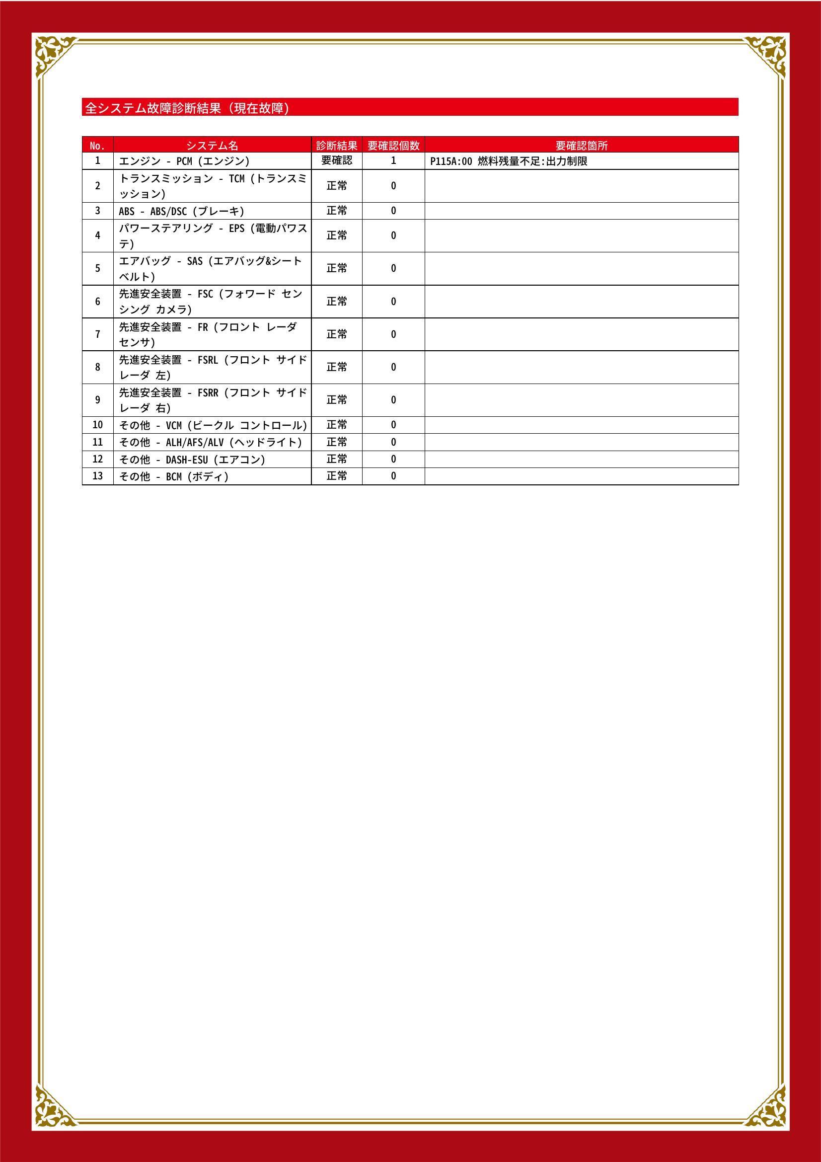| 保証項目 | その他、スタンダード・プラチナ保証をご用意。【スタンダード・プラチナ保証】では対象項目が業界最高水準の400部位以上!消耗品以外は保証にてご対応出来ます。詳細は店舗へお問い合わせください! |