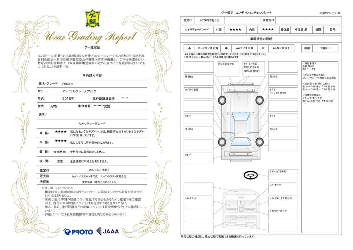 | 保証項目 | その他、スタンダード・プラチナ保証をご用意。【スタンダード・プラチナ保証】では対象項目が業界最高水準の400部位以上!消耗品以外は保証にてご対応出来ます。詳細は店舗へお問い合わせください! |