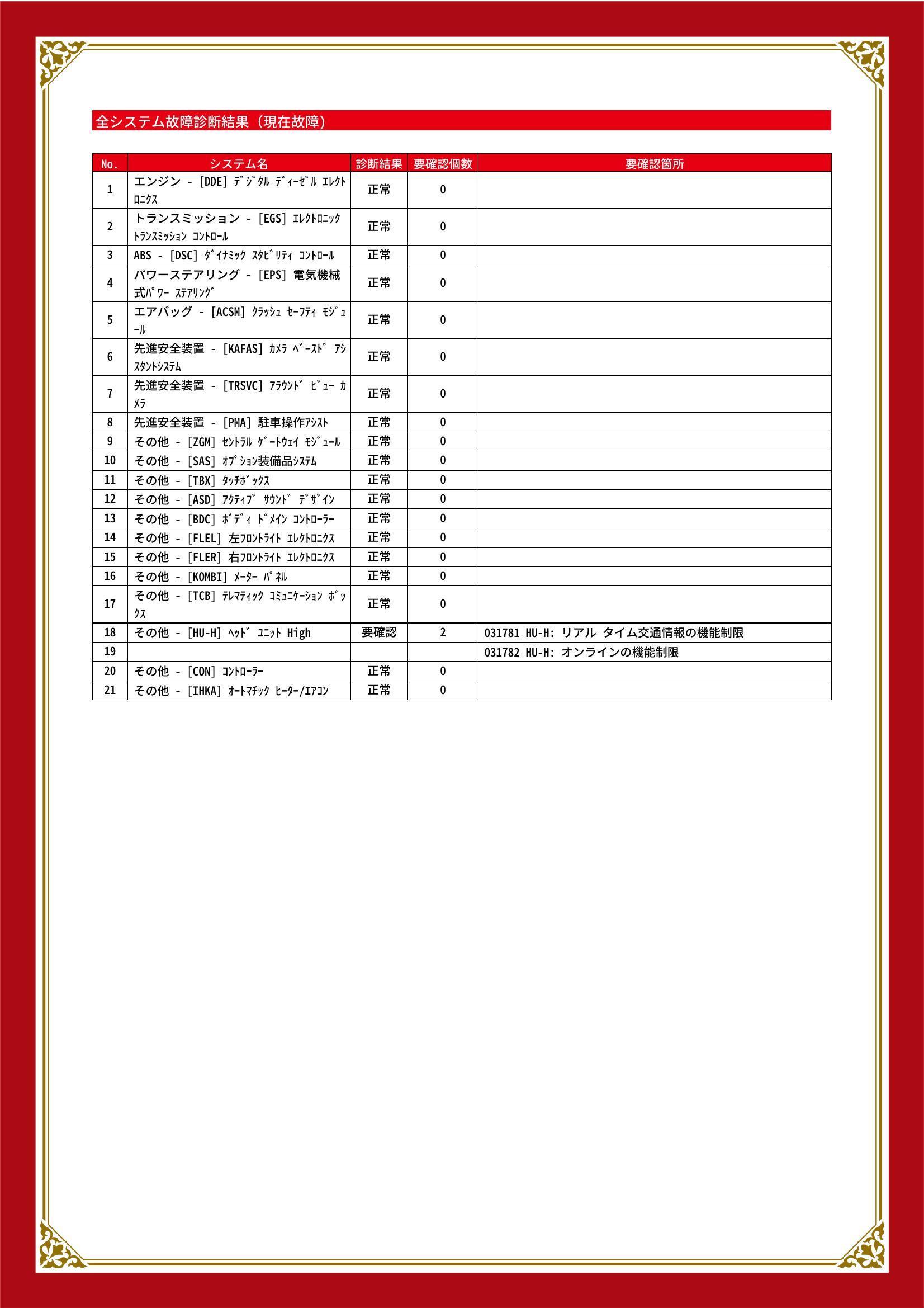 | 保証項目 | ■消耗品、油脂類、外装は保証対象外 全ての消耗部品の補充、交換に要する費用(例:ベルト類、ブレーキディスク・パッド、電球の交換等)は保証修理に含まれません |