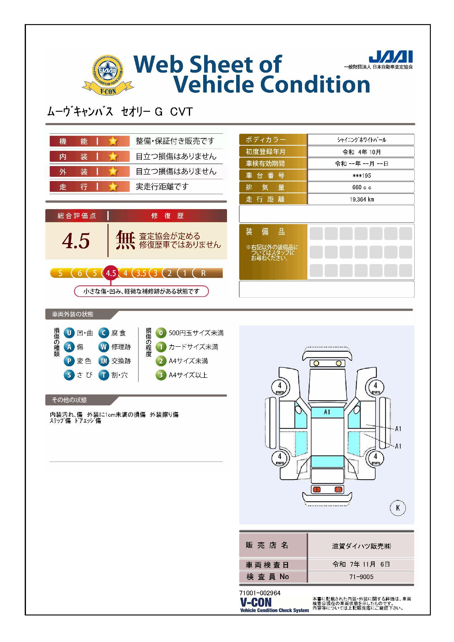 | 保証項目 | 新車メーカー保証に準じた保証(エンジン・エアコン・トランスミッション他)を1年間(走行距離無制限)無償で受けられます。 |