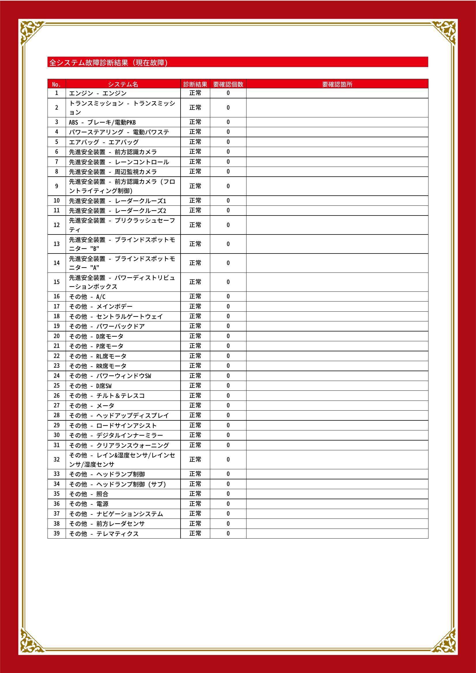 | 保証項目 | 3ヶ月・3000km以内ならエンジン、トランスミッション、ハイブリッド、ステアリング、ブレーキの各機構における主要項目を無償修理(または交換)いたします。 |