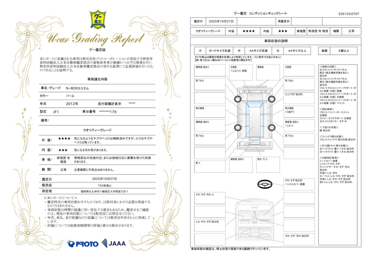 Goo鑑定とは在庫車輌を第三者機関である日本自動車鑑定協会(JAAA)が鑑定し、内装&外装の評価点を5点満点でGoo−net上に開示する事です。そうする事によってお車の情報を明確にし、お客様に信頼をお届け致しております。修復暦の不正表示やメーター改ざん等は一切御座いません。