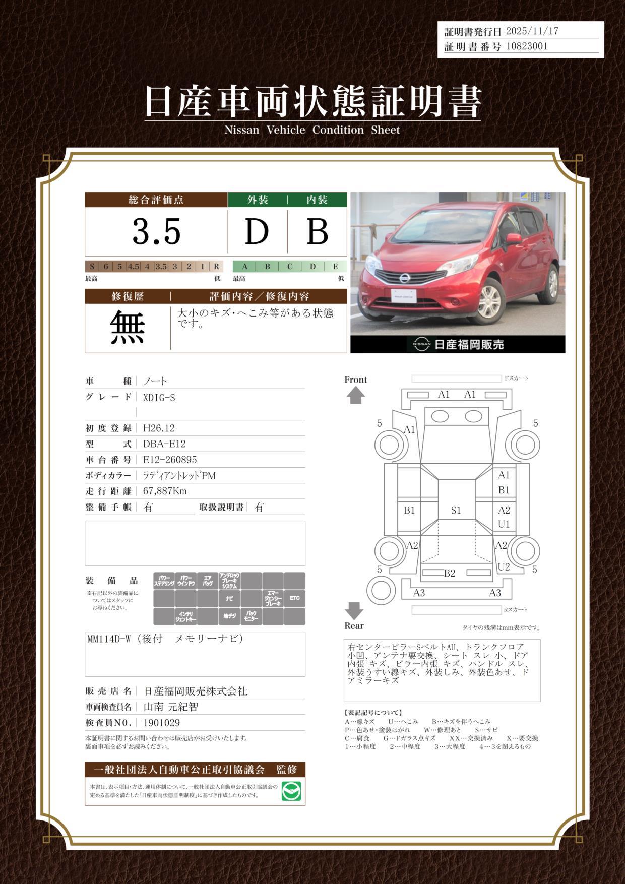 [保証付]:12ヶ月・走行無制限 パーツ類を走行距離無制限で無料保証。1ヶ月または1,000kmの無料点検付き。信頼の日産サービス工場で、全国どこでも点検&修理ができるので、ご購入後も安心です 詳しくはお気軽にお問合せください! |