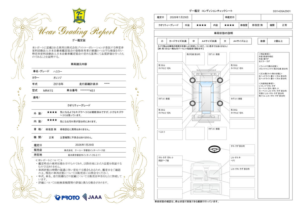 ケーユーでは修復歴の有無を全車に表示。公的機関「(財)日本自動車査定協会」の基準を採用した車両状態評価証というチェックシートを添付して、ご契約頂きましたらお客様にお渡ししております。 28